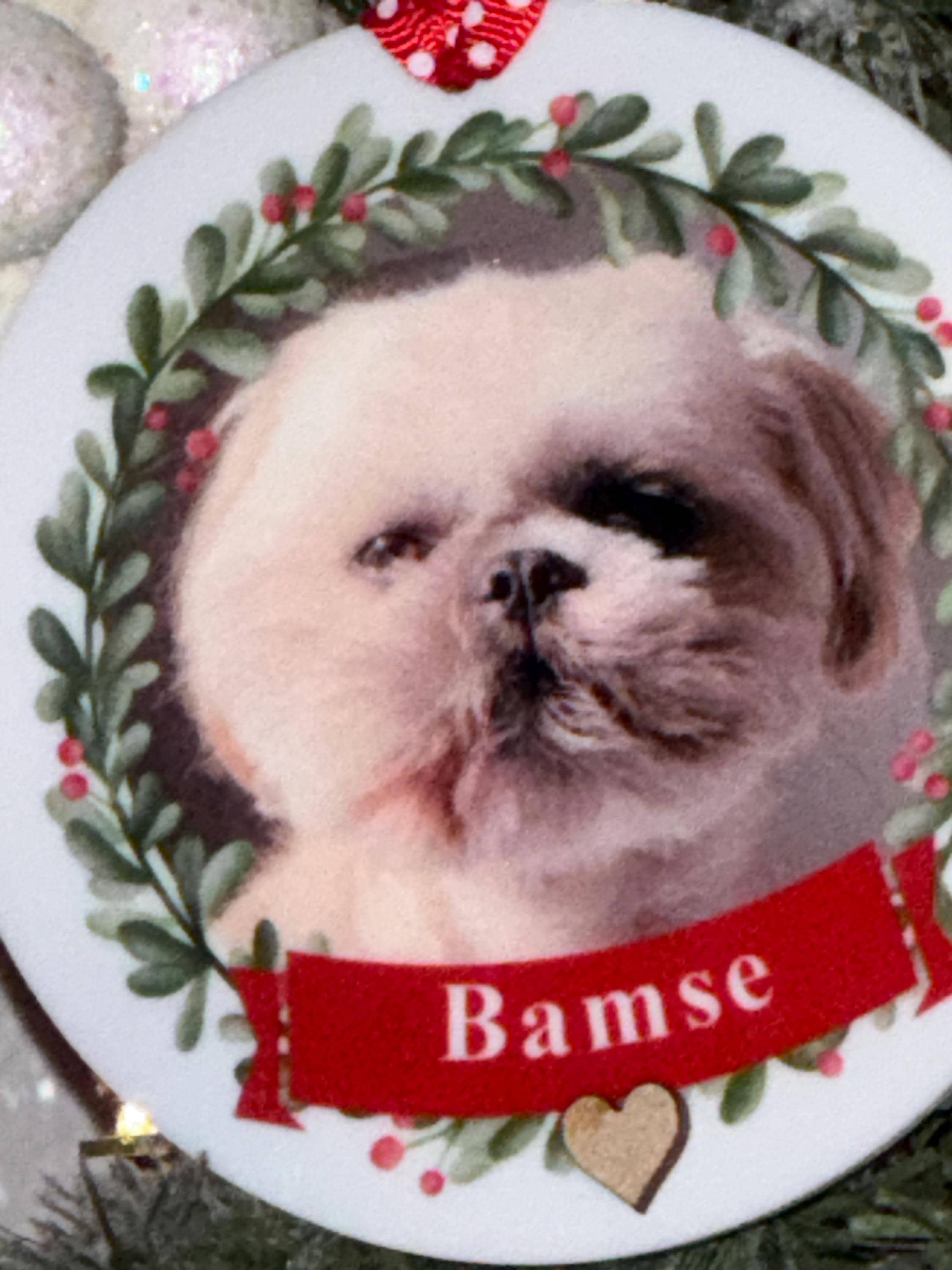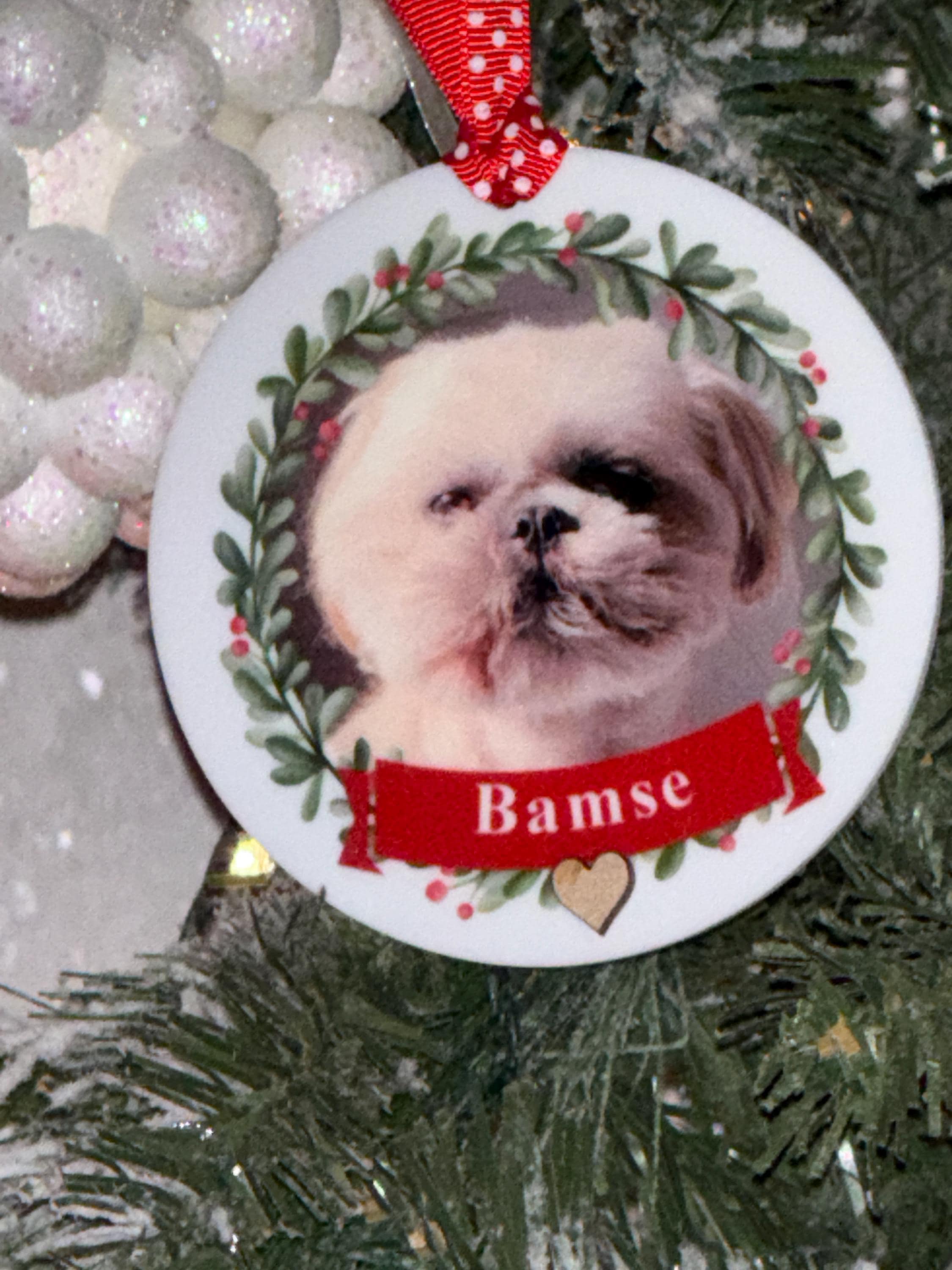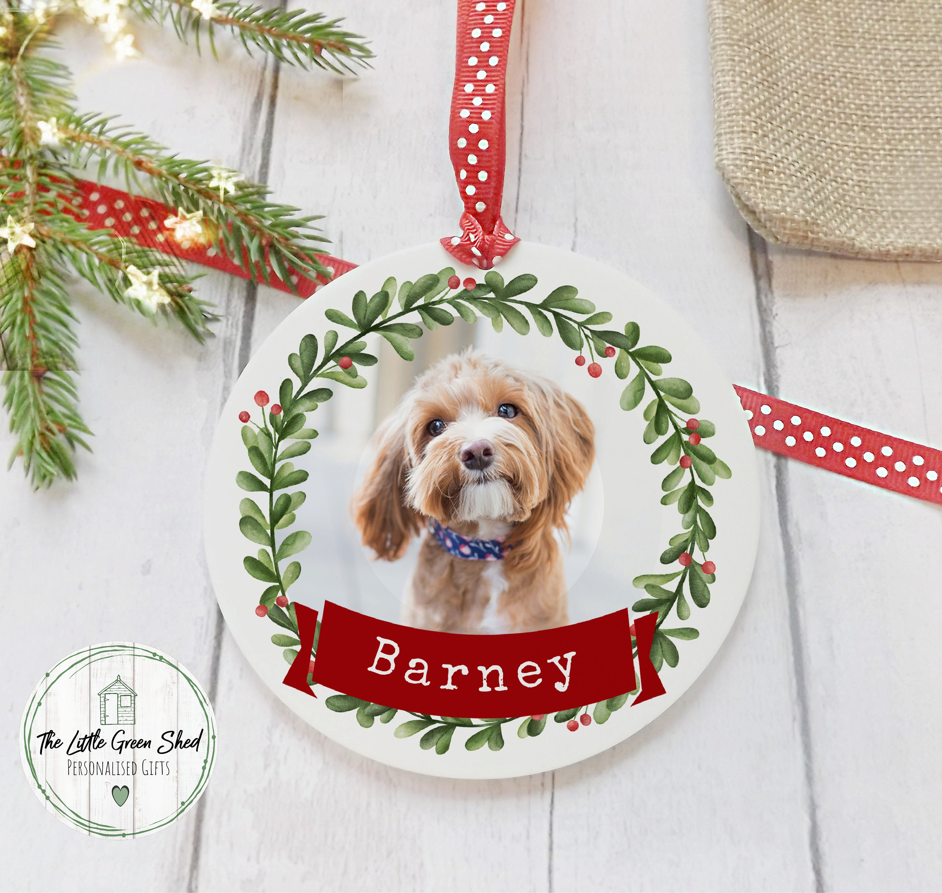Your decoration will be made with a photo of your pet which has a wreath design and banner added. Simply message over a name and photo in a message to make this a gift unique to you.