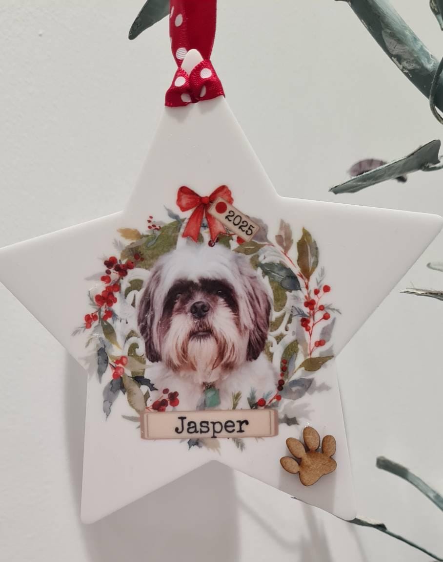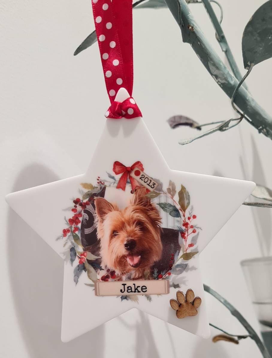 A beautiful way to show off or remember your beautiful pet. This star looks beautiful hanging on a tree mantle or hook.