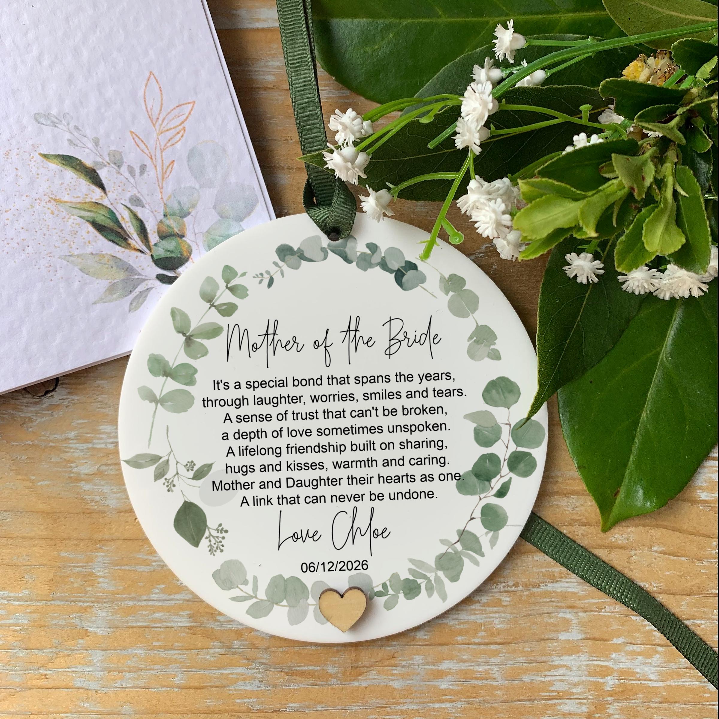 Honour the most important woman in your life with this beautiful Mother of the Bride keepsake. Thoughtfully designed with a delicate green wreath motif printed on high-quality acrylic, this elegant plaque makes a heartfelt wedding day gift your mum will treasure forever. Whether displayed on a vanity, shelf, or desk, it’s a touching reminder of your love and appreciation on one of life’s most meaningful days.