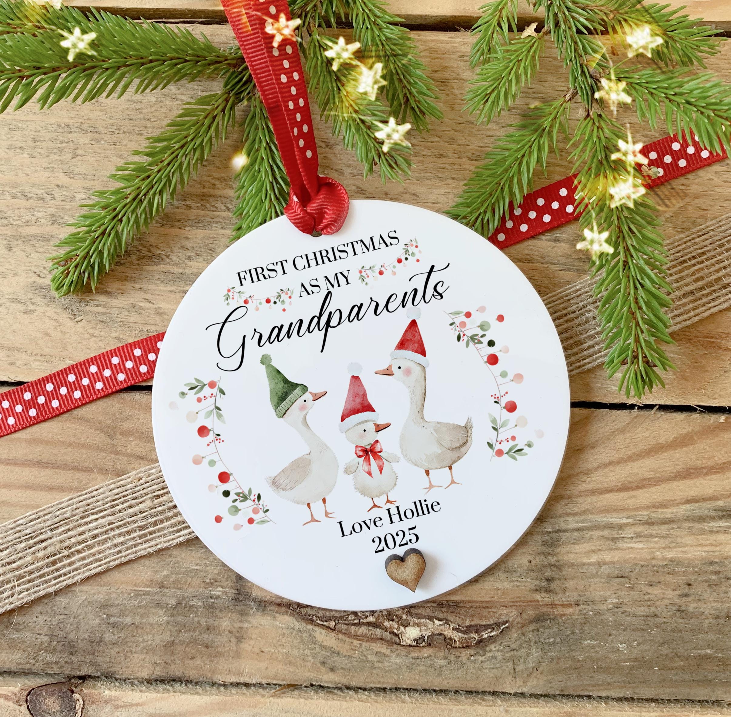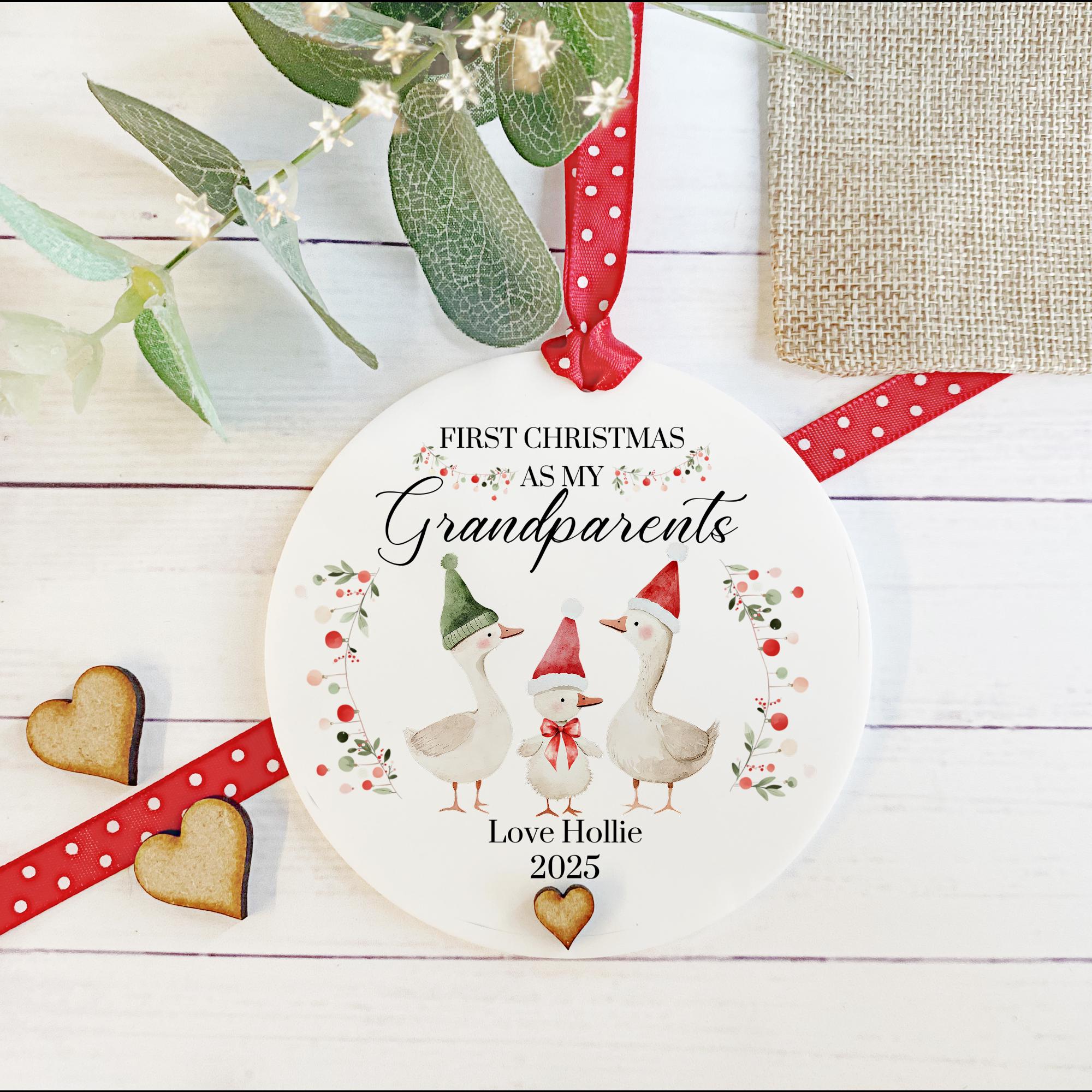 A "Grandparents First Christmas" tree decoration is a heartwarming and personalised ornament designed to commemorate a first Christmas. This features elements that highlight the special milestone, such as the baby’s name, the year of their first Christmas,