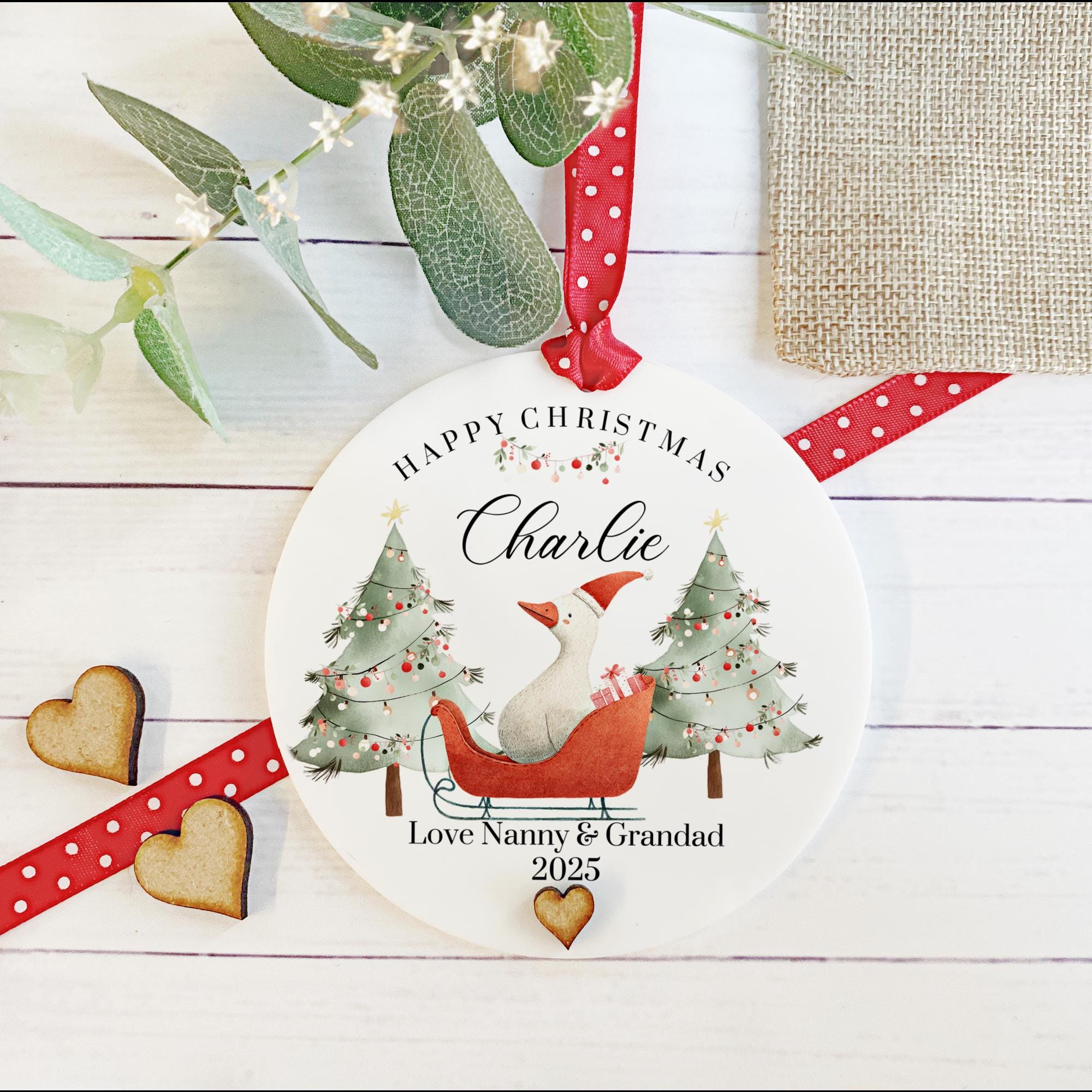 Celebrate the magic of Christmas with this adorable personalised acrylic bauble! Featuring a charming Christmas goose surrounded by festive elements, this keepsake is perfect for children. Customise it with your child’s name and the year to create a treasured memory that will hang on your tree for years to come. Made from high-quality acrylic, it catches the light beautifully, adding a festive sparkle to your holiday décor.