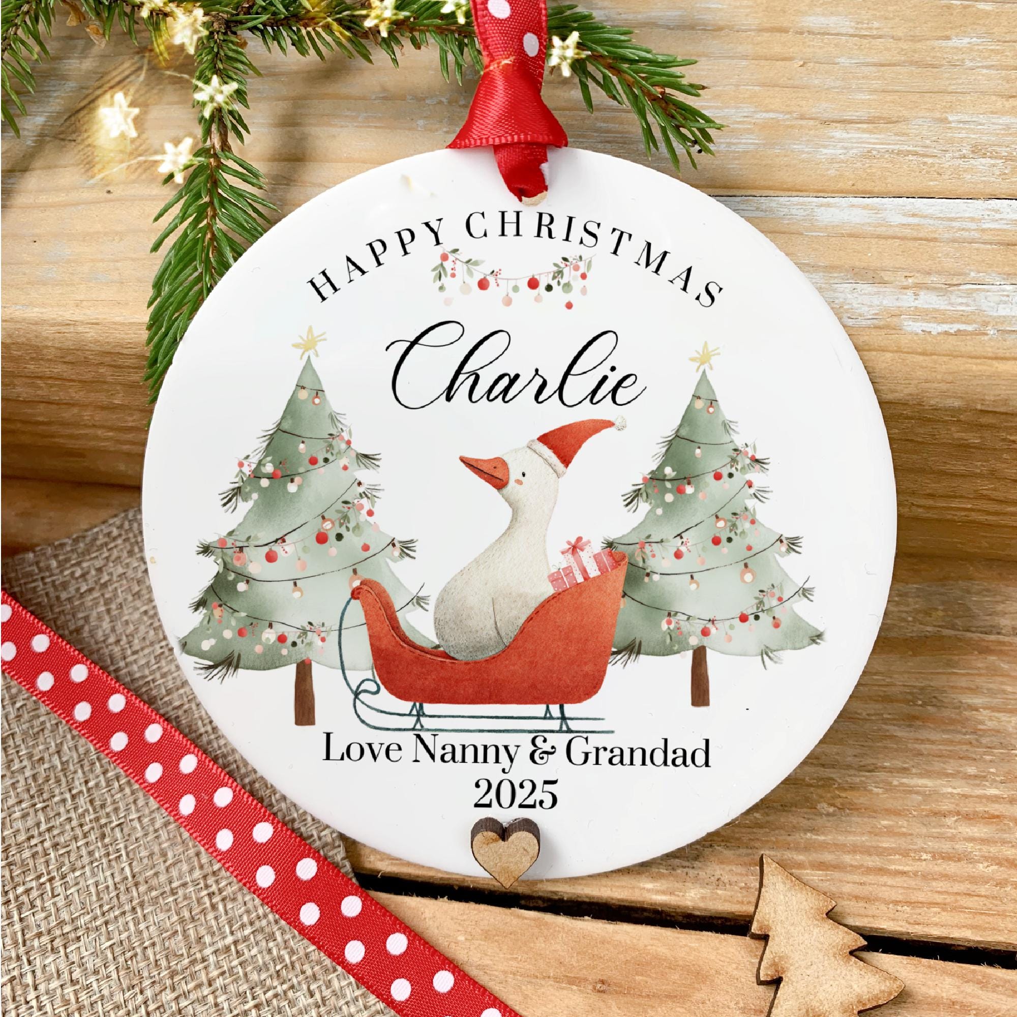 Celebrate the magic of Christmas with this adorable personalised acrylic bauble! Featuring a charming Christmas goose surrounded by festive elements, this keepsake is perfect for children. Customise it with your child’s name and the year to create a treasured memory that will hang on your tree for years to come. Made from high-quality acrylic, it catches the light beautifully, adding a festive sparkle to your holiday décor.