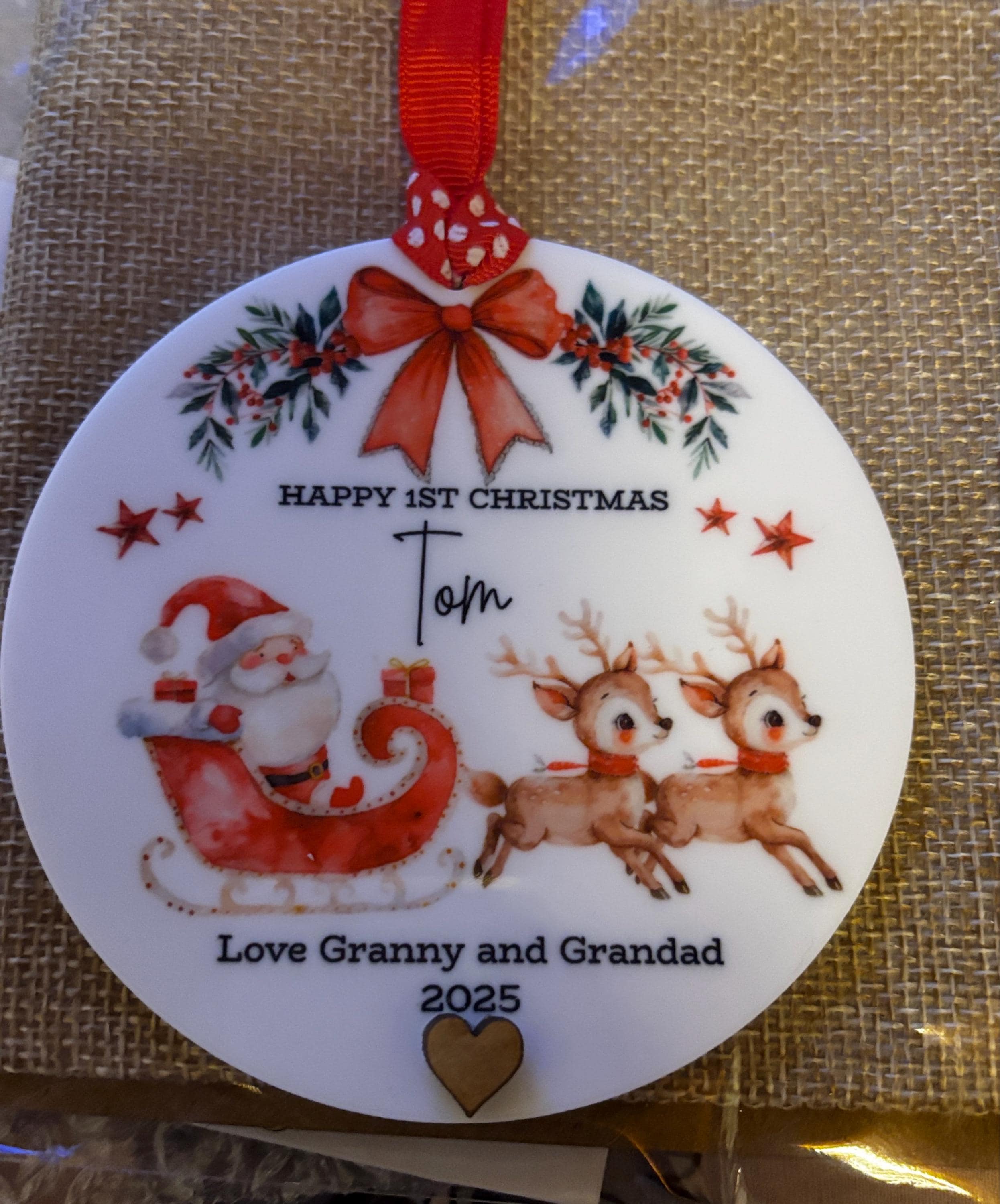 A "Baby's First Christmas" tree decoration is a heartwarming and personalised ornament designed to commemorate a baby's very first Christmas. This features elements that highlight the special milestone, such as the baby’s name, the year of their first Christmas,
