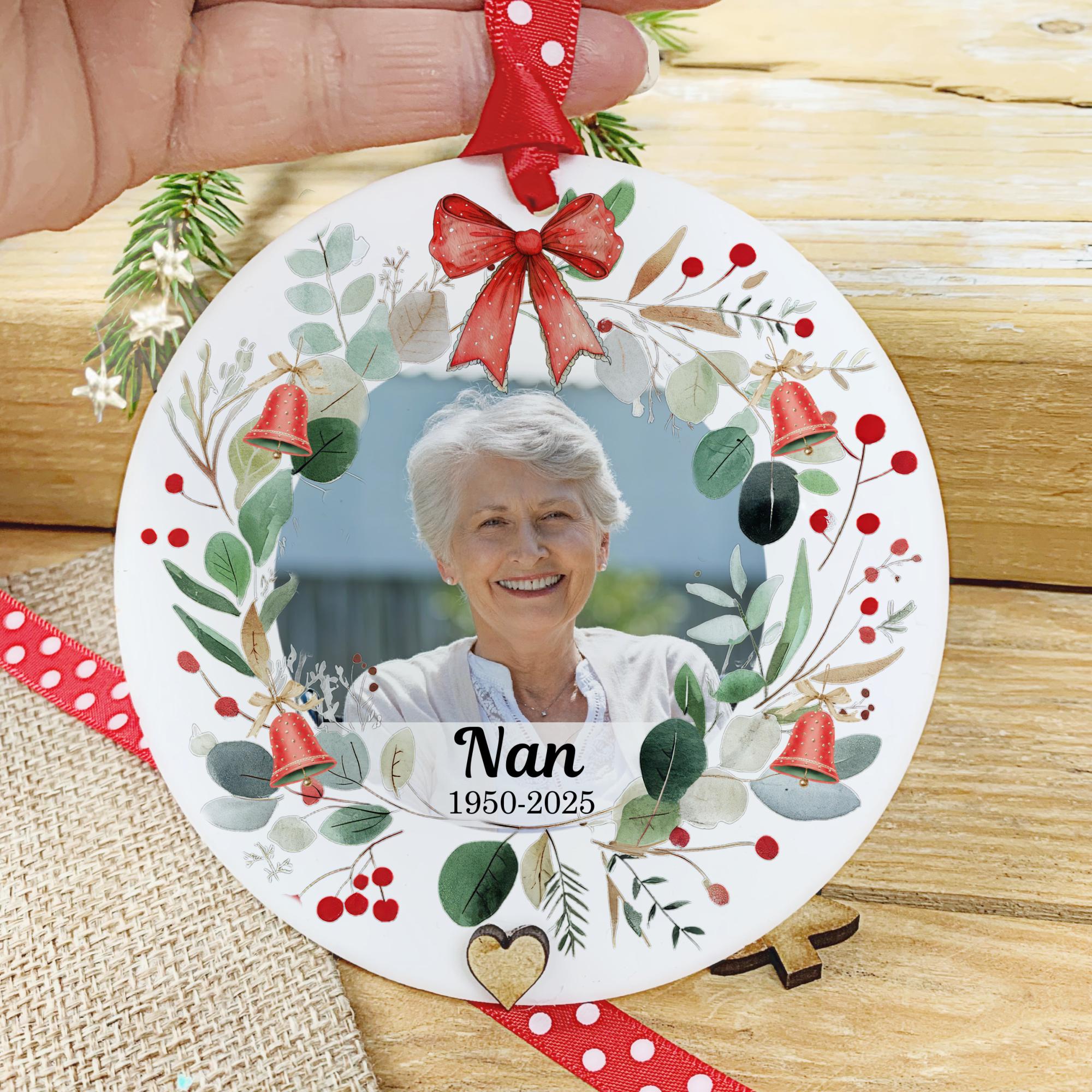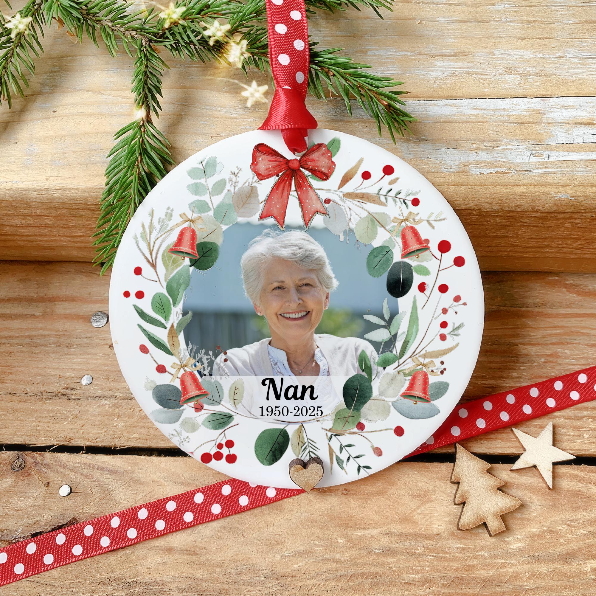 Honour the memory of a loved one with this beautiful Christmas memorial bauble featuring an elegant wreath design. Each ornament is carefully crafted to bring comfort and remembrance this Christmas