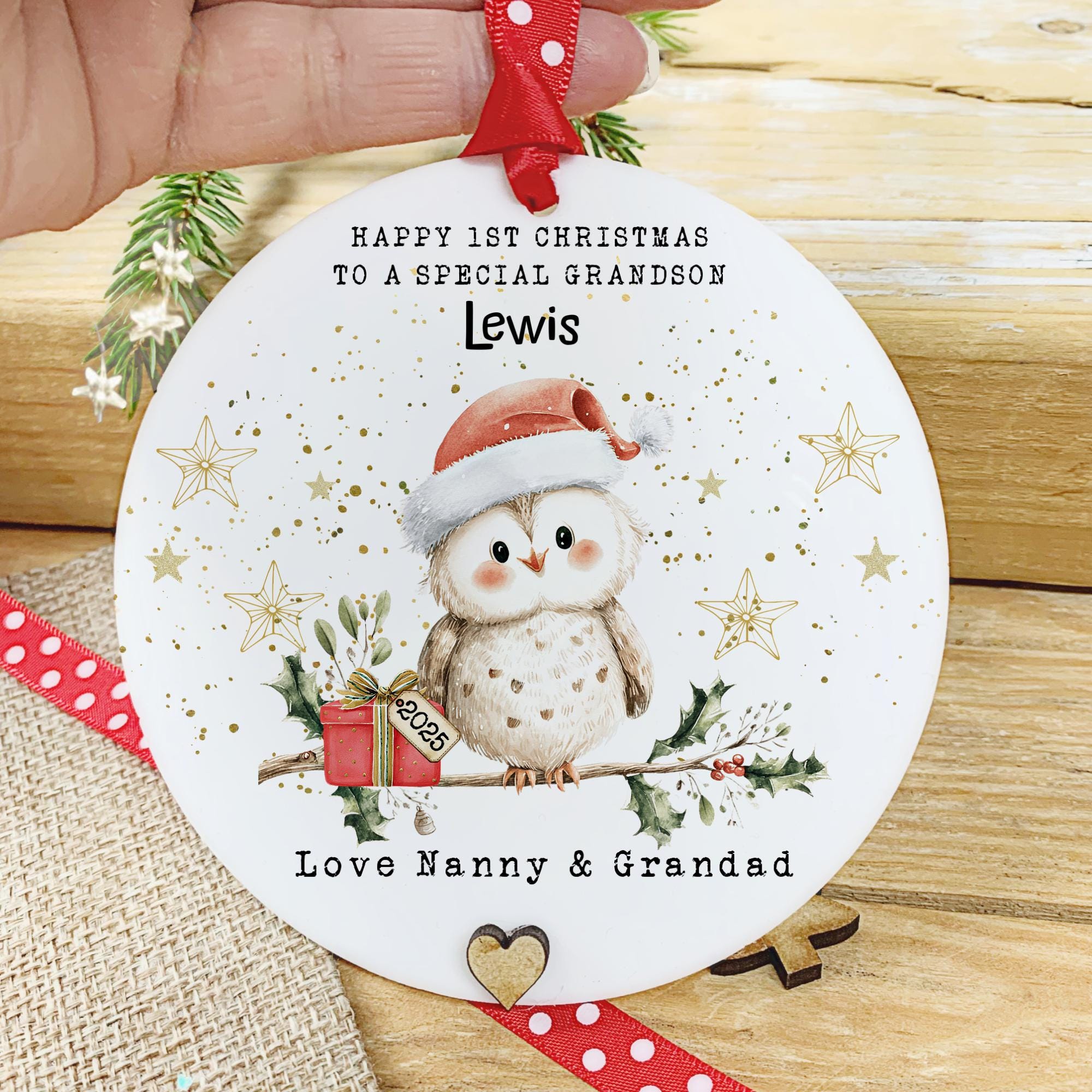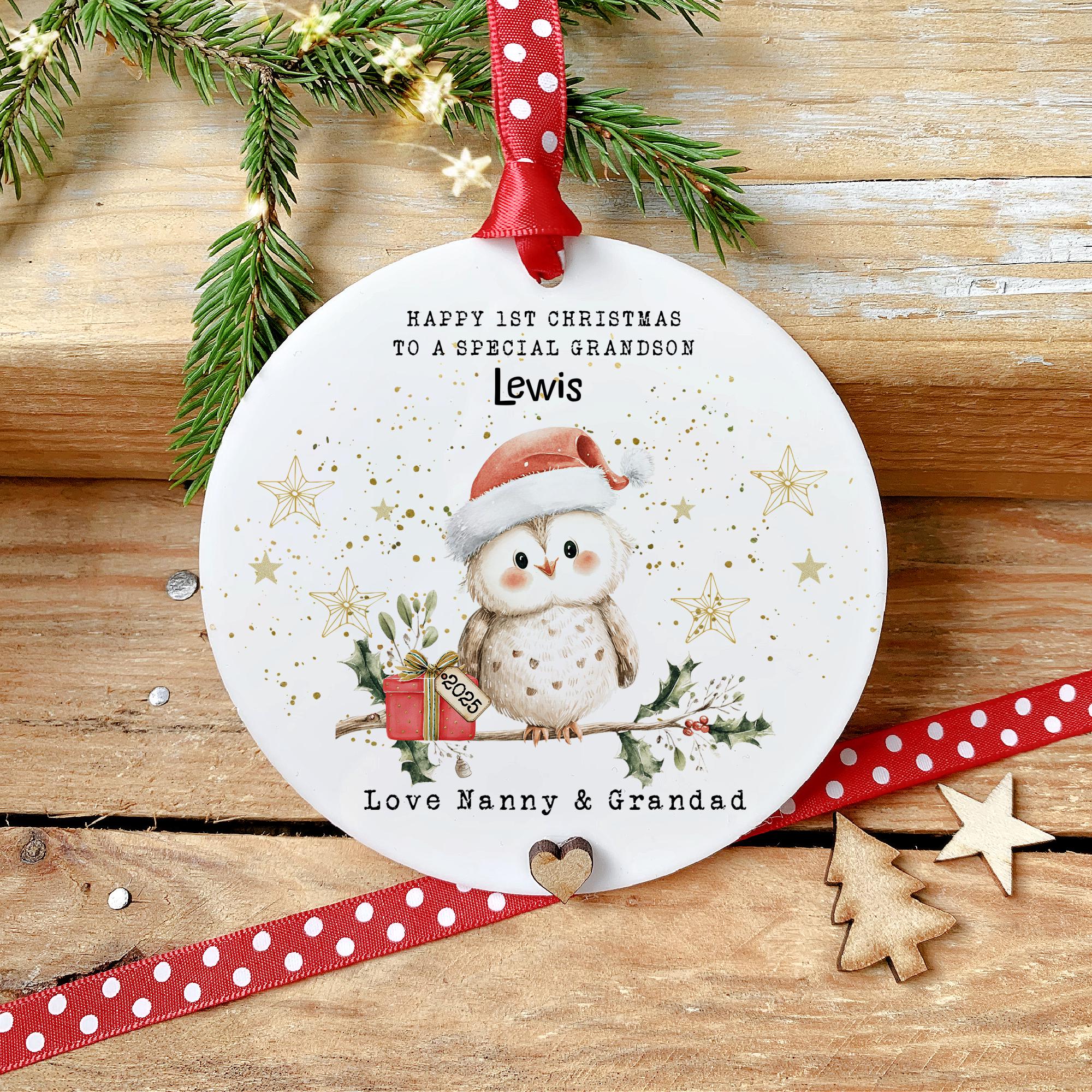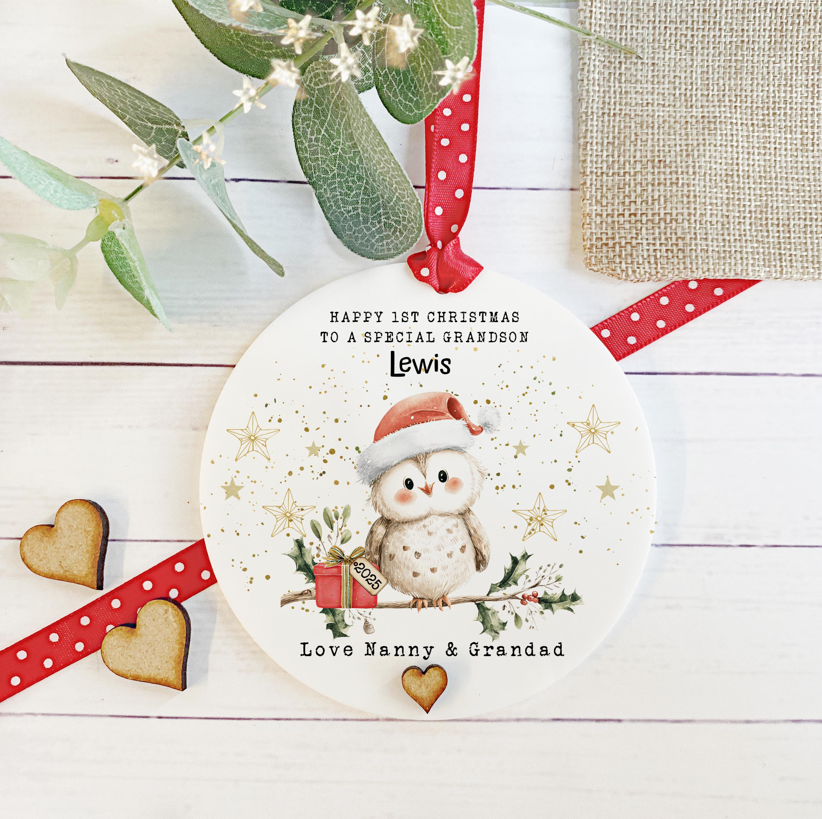 Celebrate the magic of Christmas with this adorable personalised acrylic bauble! Featuring a charming Christmas Owl surrounded by festive elements, this keepsake is perfect for children. Customise it with your child’s name and the year to create a treasured memory that will hang on your tree for years to come. Made from high-quality acrylic, it catches the light beautifully, adding a festive sparkle to your holiday décor.
