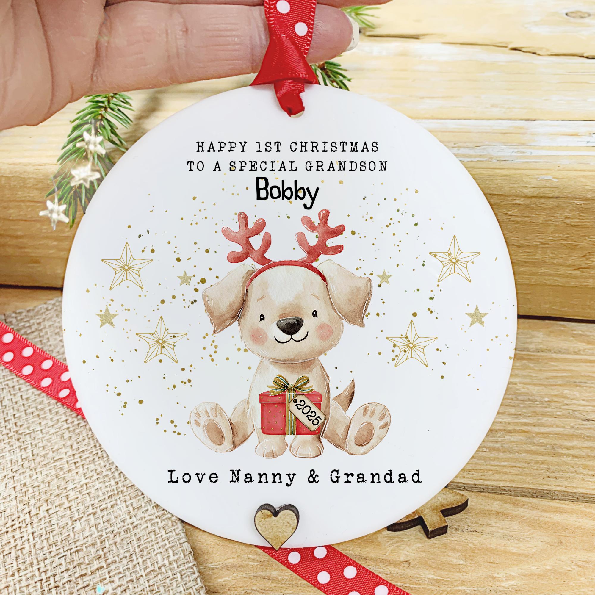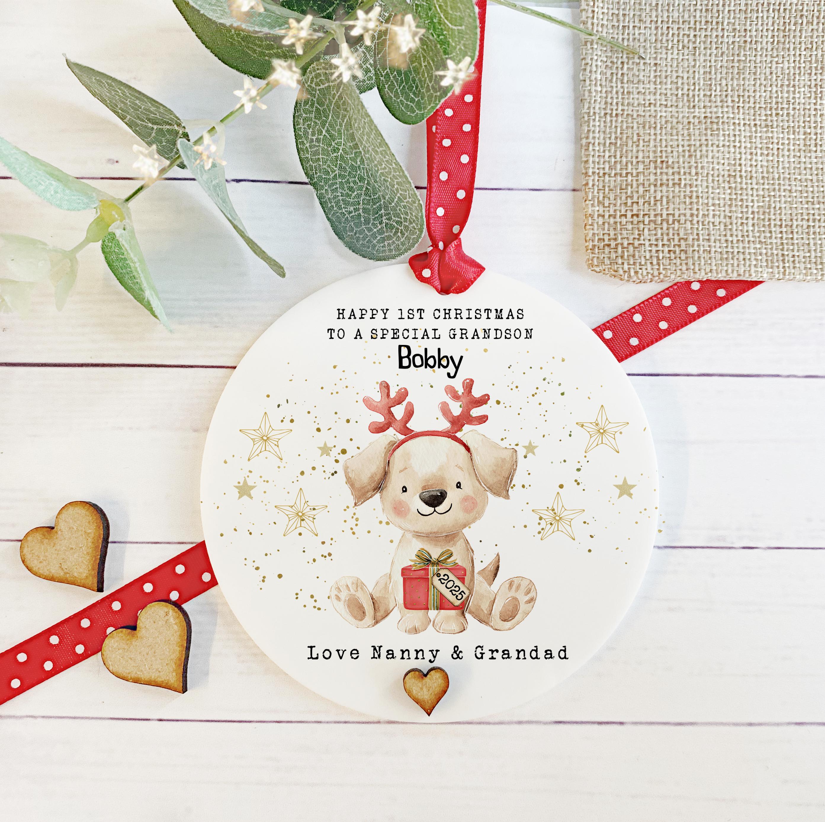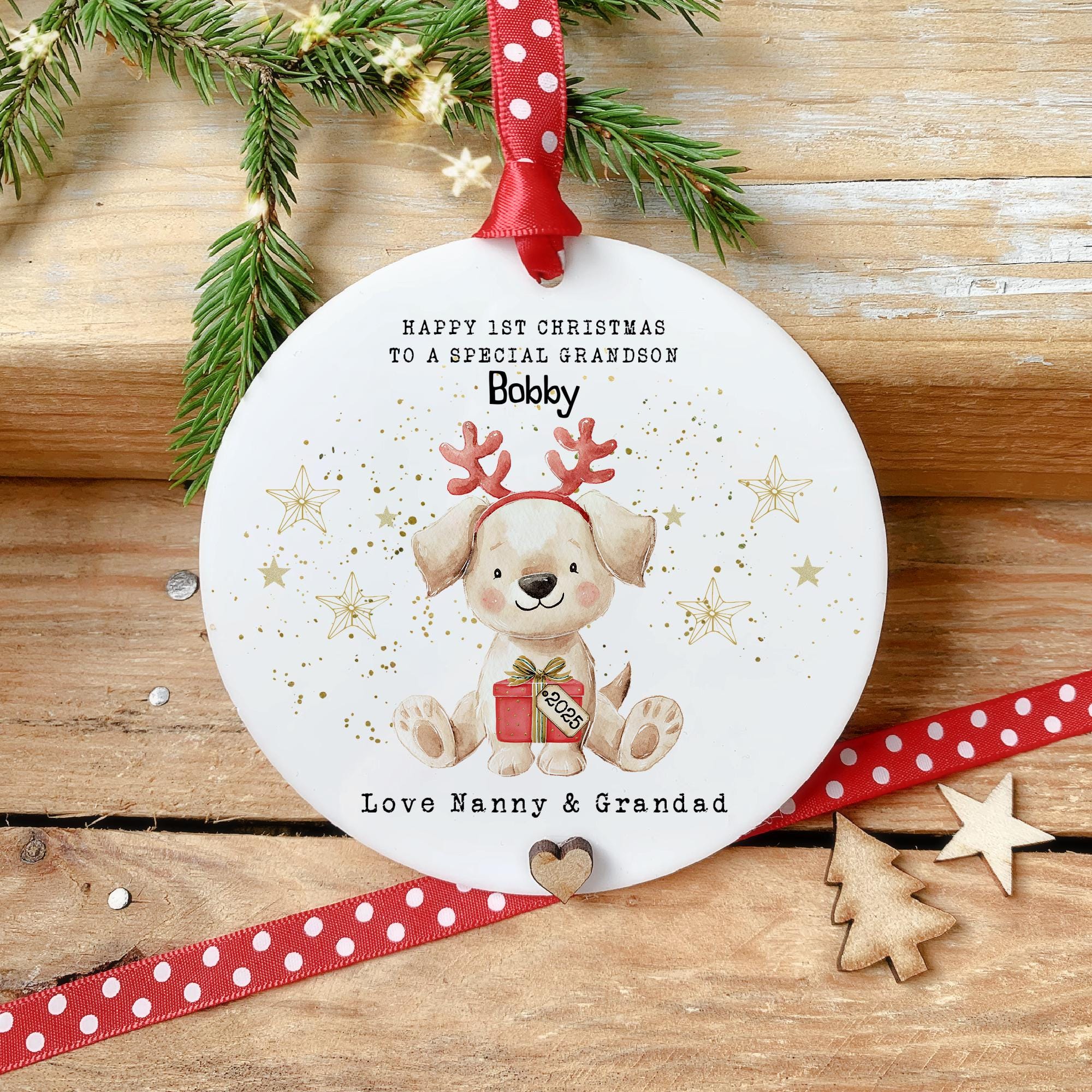 Celebrate the magic of Christmas with this adorable personalised acrylic bauble! Featuring a charming Christmas Puppy surrounded by festive elements, this keepsake is perfect for children. Customise it with your child’s name and the year to create a treasured memory that will hang on your tree for years to come. Made from high-quality acrylic, it catches the light beautifully, adding a festive sparkle to your holiday décor.