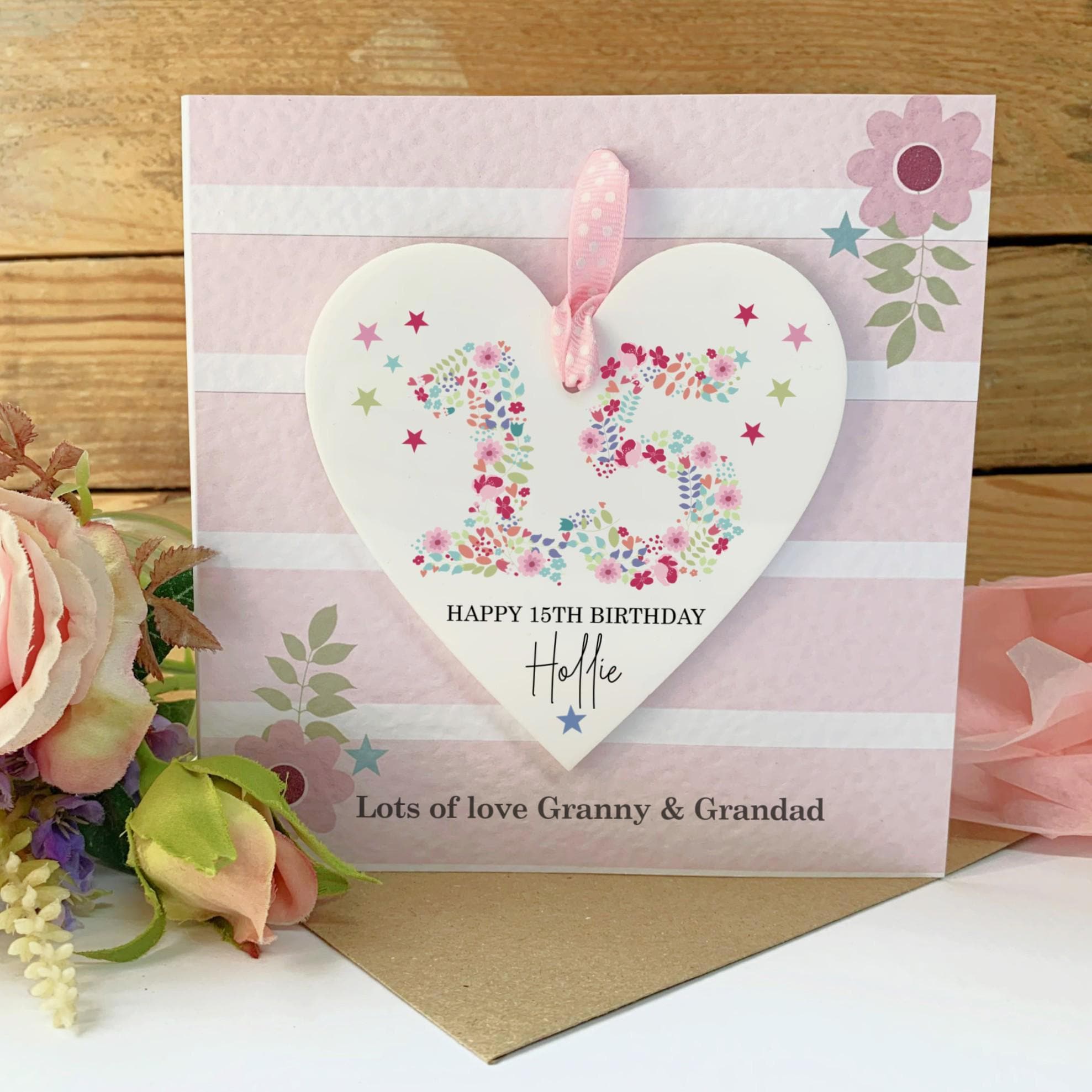 A beautiful 15th birthday keepsake card for your granddaughter, featuring a lovely acrylic heart she can treasure long after her birthday.