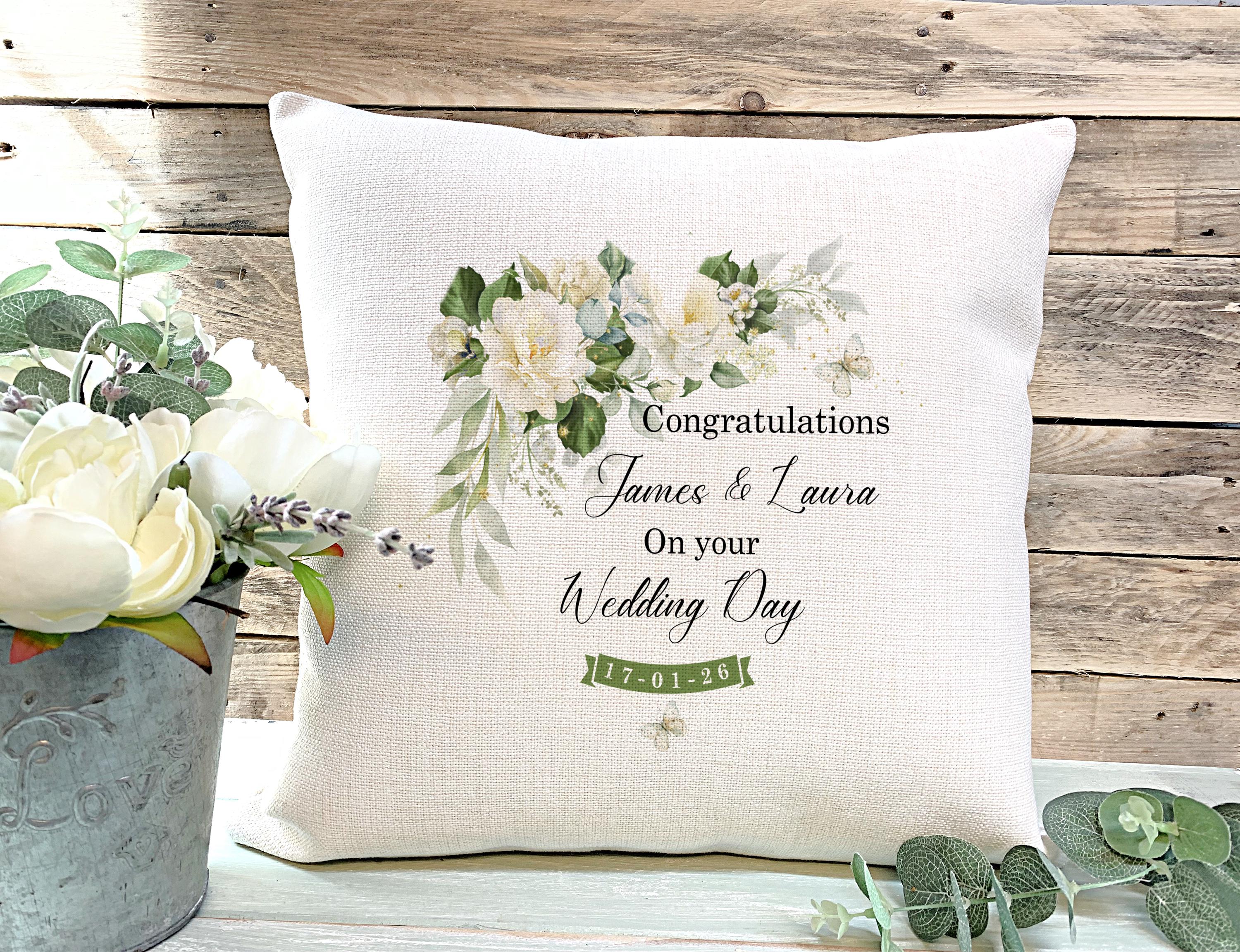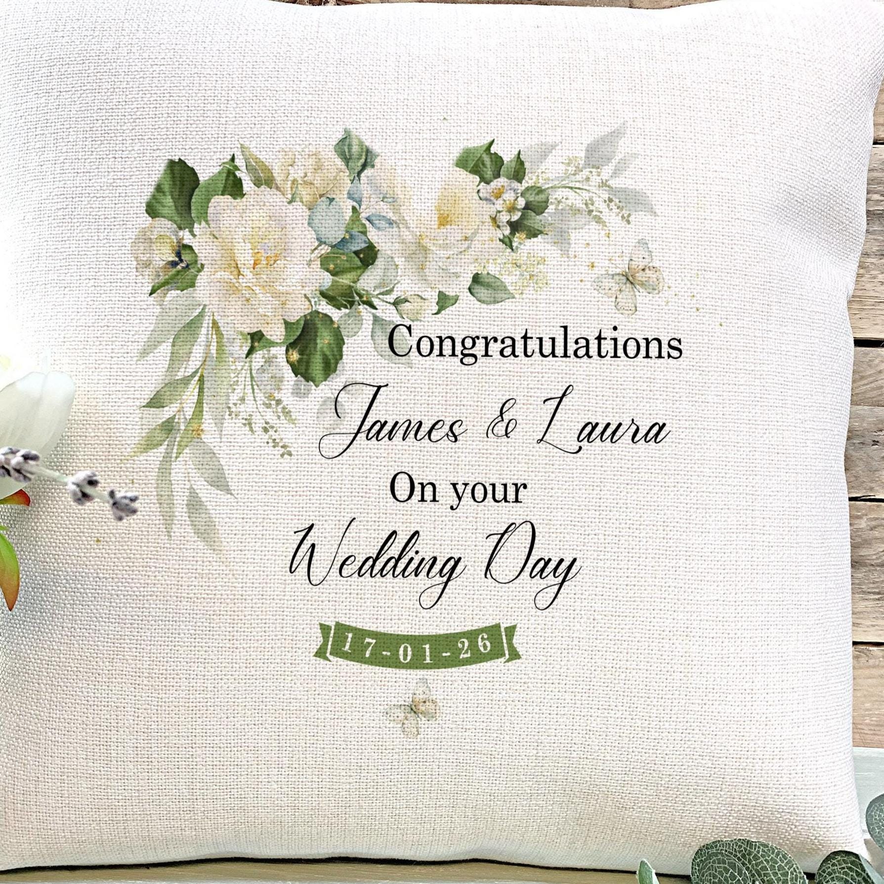 This linen cushion cover has a natural Linen style canvas finish. Each cushion is personalised with your details making it a unique gift.