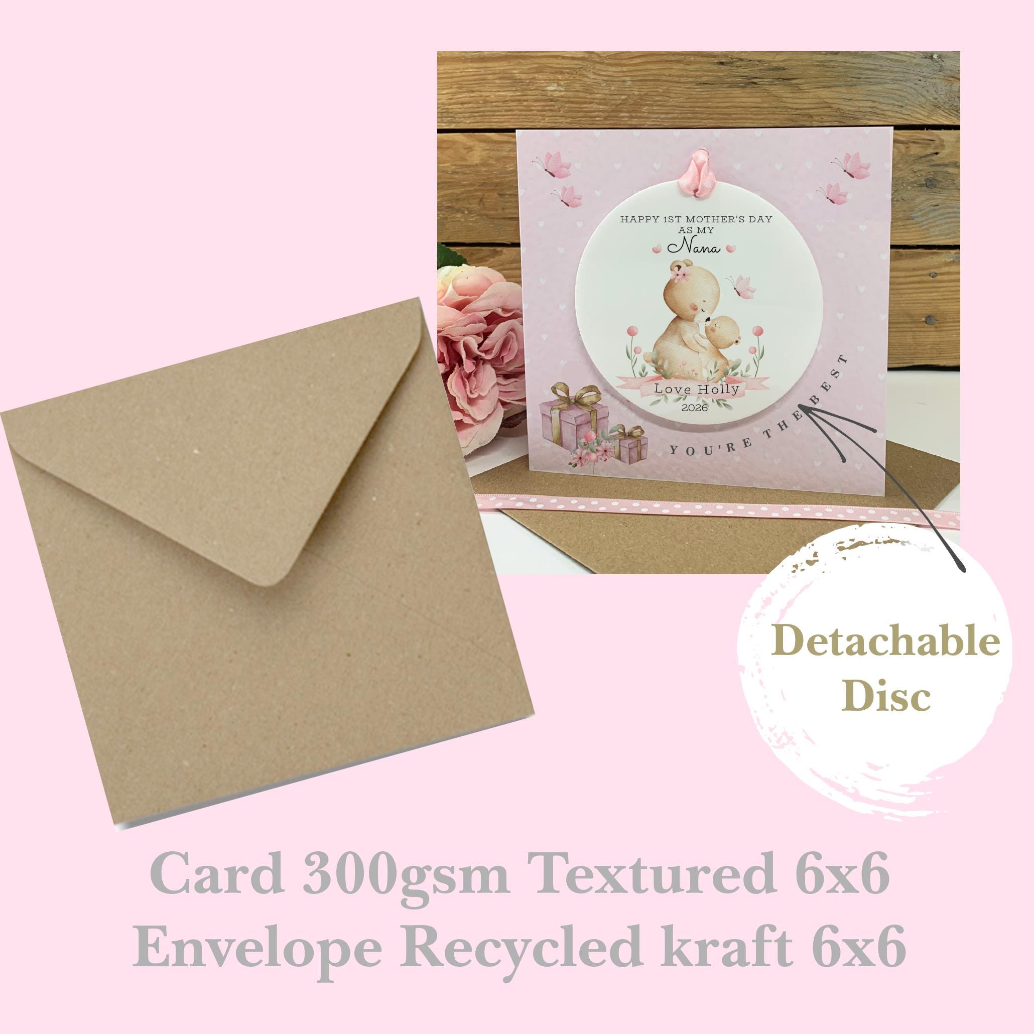 This handcrafted Mother's day card features an enchanting Nana & Baby Bear design and includes a detachable keepsake that can be saved long after the card is opened. Thoughtfully created to mark this special Day, it’s the perfect way to show love, pride, and magic on her day