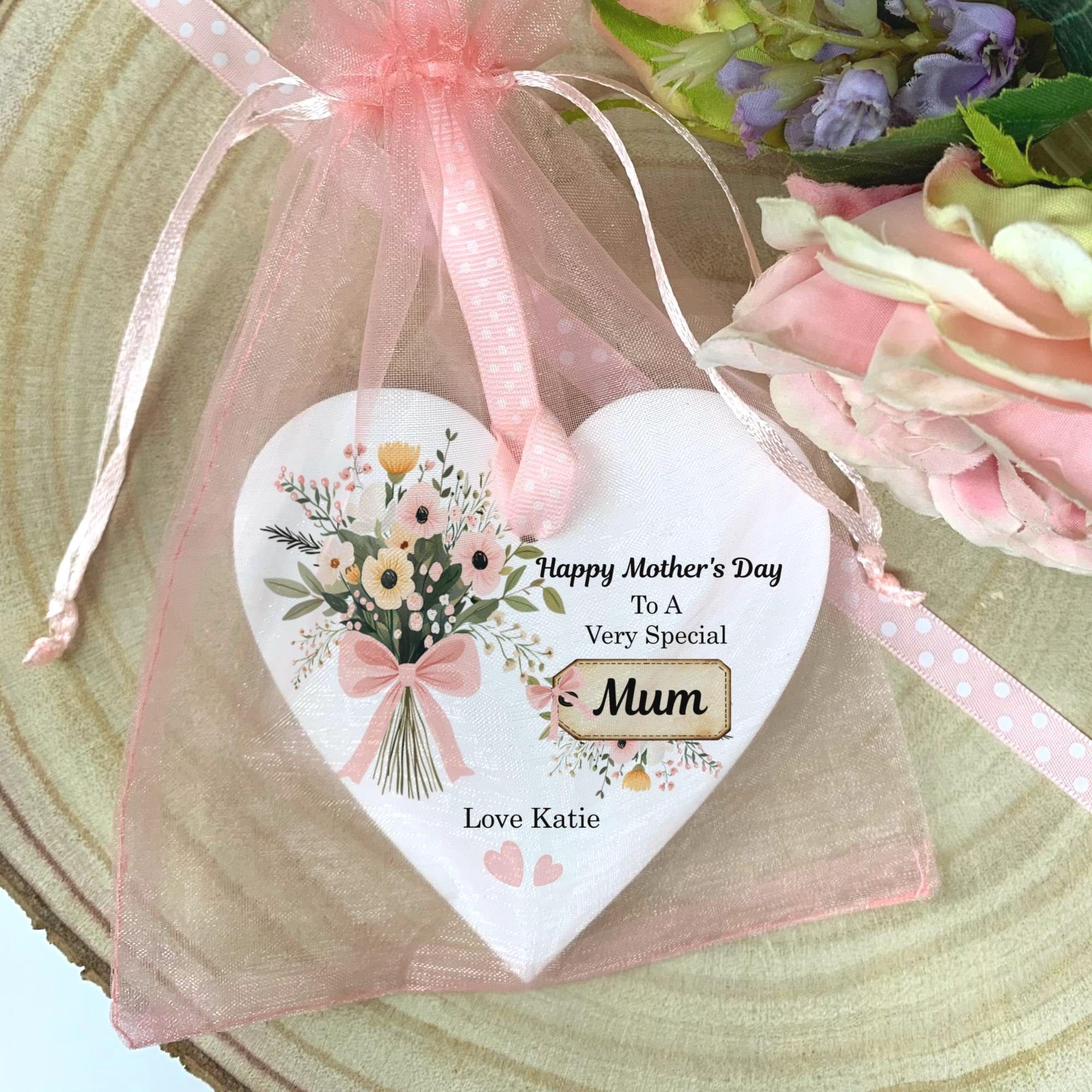 Mother’s Day Keepsake Heart for Mum – Mum Gift from Daughter Son – Floral Hanging Ornament – Thank You Mum Keepsake – Free Organza Gift Bag