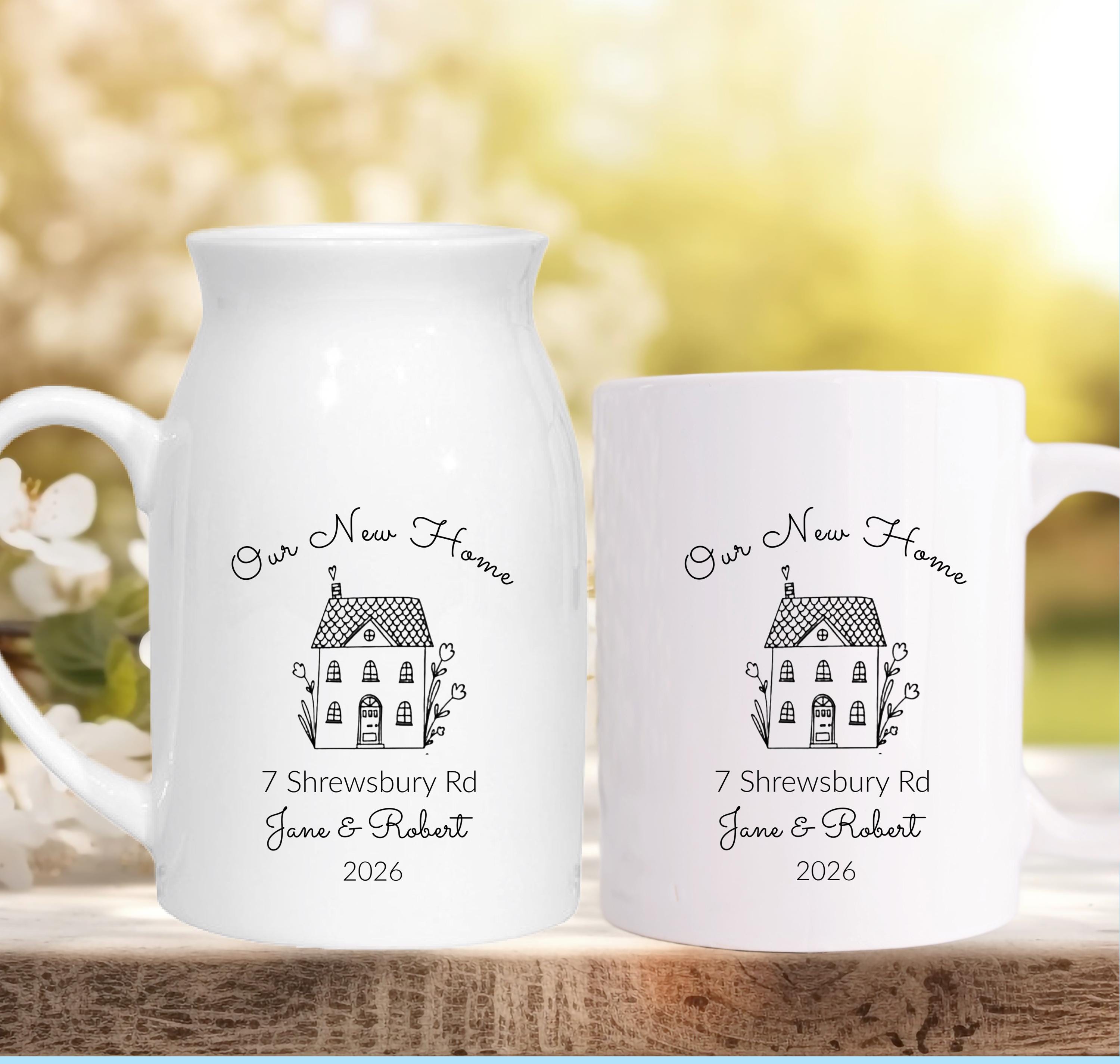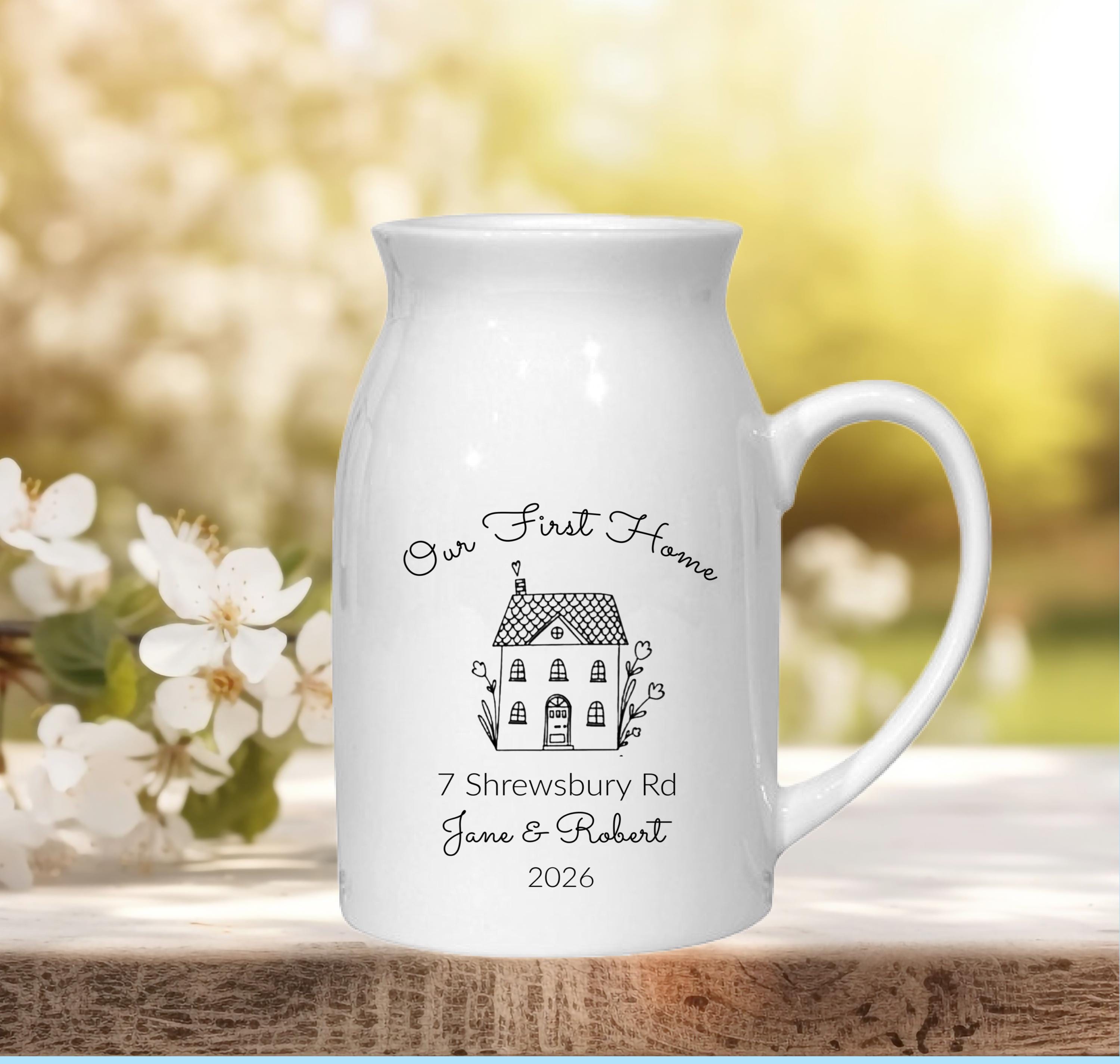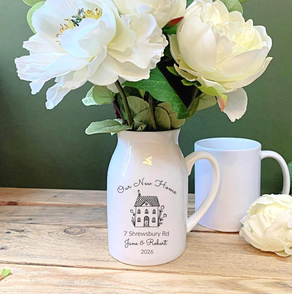 Designed with a timeless aesthetic, it serves as a beautiful moving in keepsake that can be used as a functional milk jug or a decorative flower vase for a "home sweet home" feel.