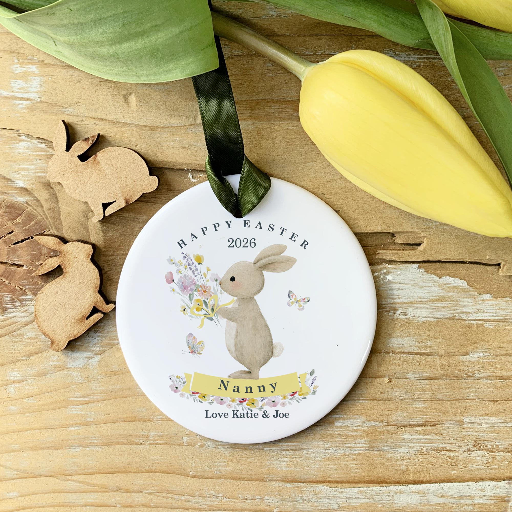 Celebrate Easter in style with a beautifully personalised ceramic mug or Ceramic Keepsake! Featuring a charming spring flower and floral bunny design, the mug/keepsake are the perfect gifts for Nanny, Grandad, or any loved one. Whether used for coffee, tea, or pick the decorative ornament, they are a thoughtful reminder of your love.