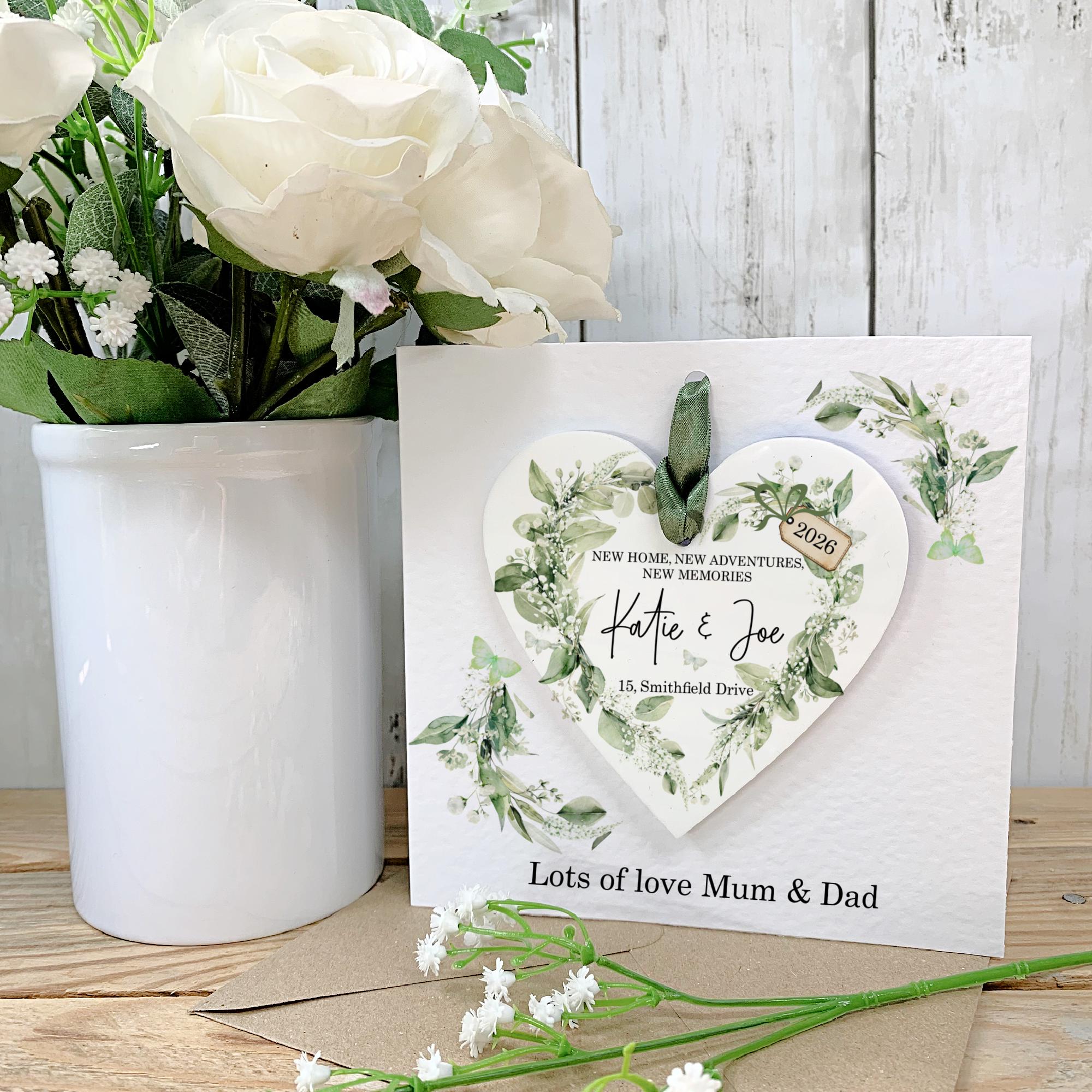Designed with a timeless aesthetic, each gift serves as a beautiful moving in keepsake that can be used hanging ornament or flower decoration great for a "home sweet home" feel. Hang the keepsake ove detached from the card on on a hook or place to look at each day.