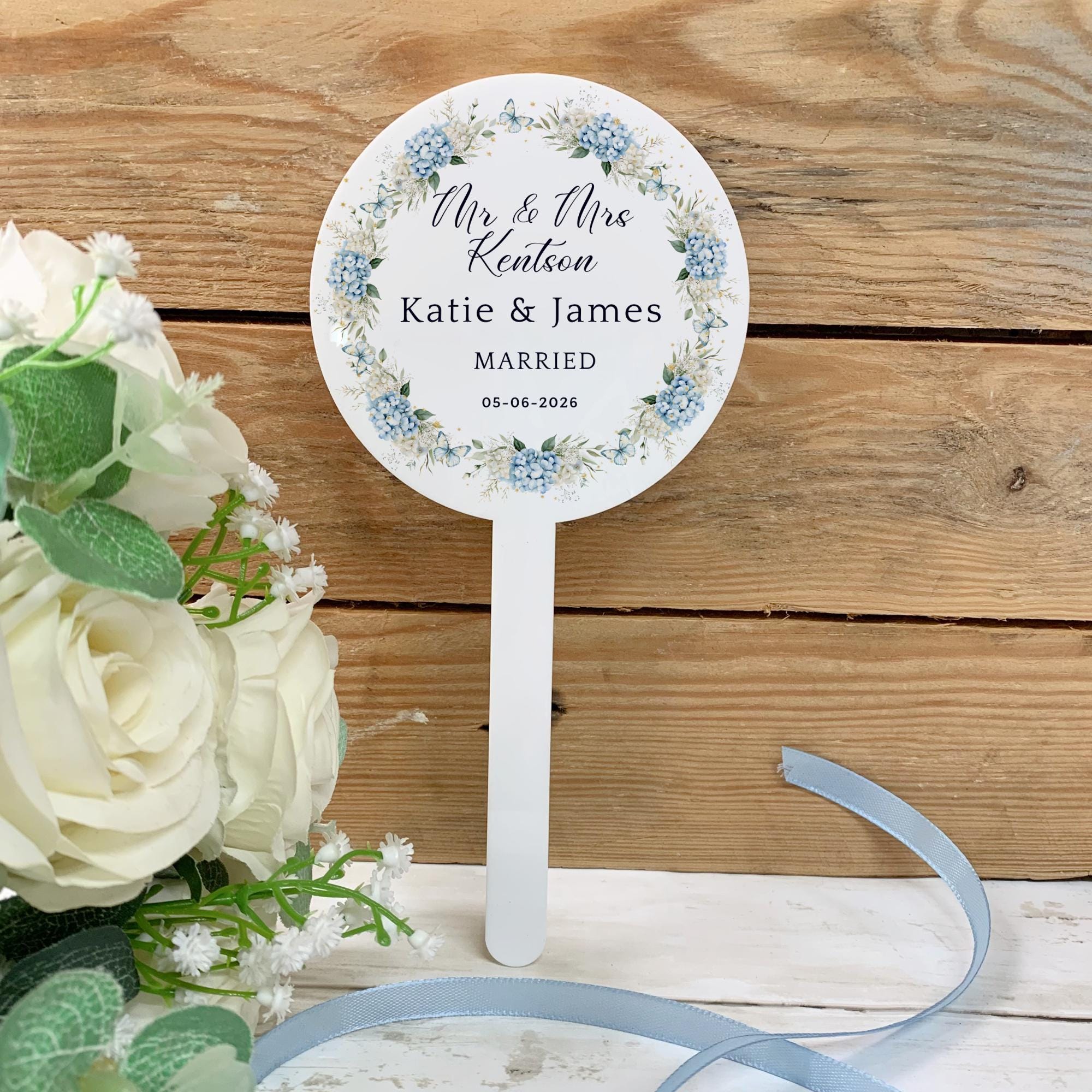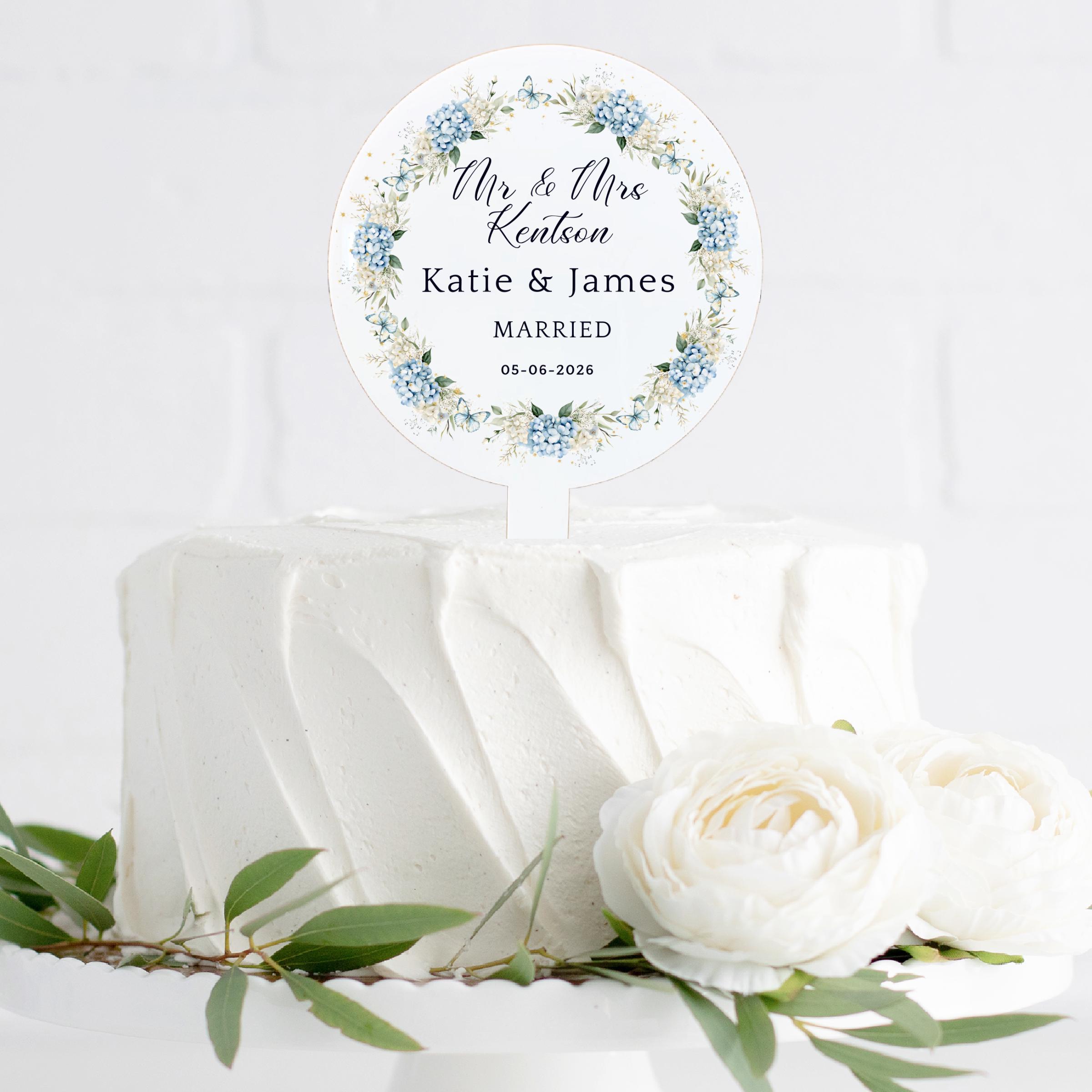 💙 Blue Floral Wedding Cake Topper – Personalised Elegant Wedding Decor