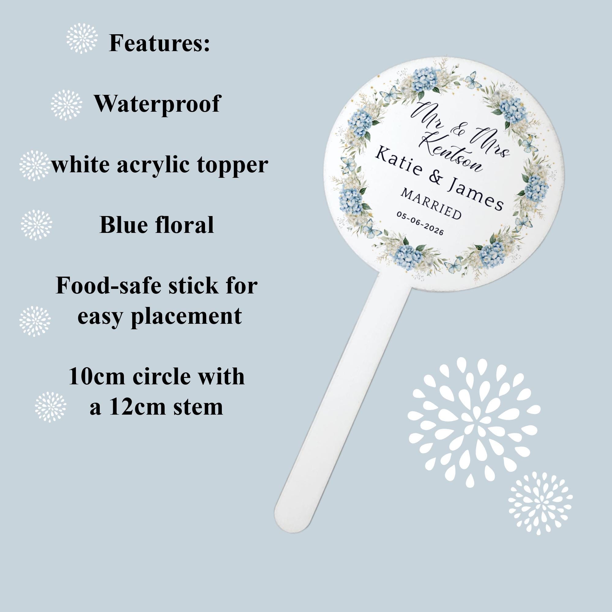 Make your wedding cake truly unforgettable with this beautiful blue floral wedding cake topper, designed to add a romantic and elegant touch to your special day. Featuring delicate floral details in stunning blue tones, this topper is perfect for dusty blue, rustic, garden, or classic wedding themes.