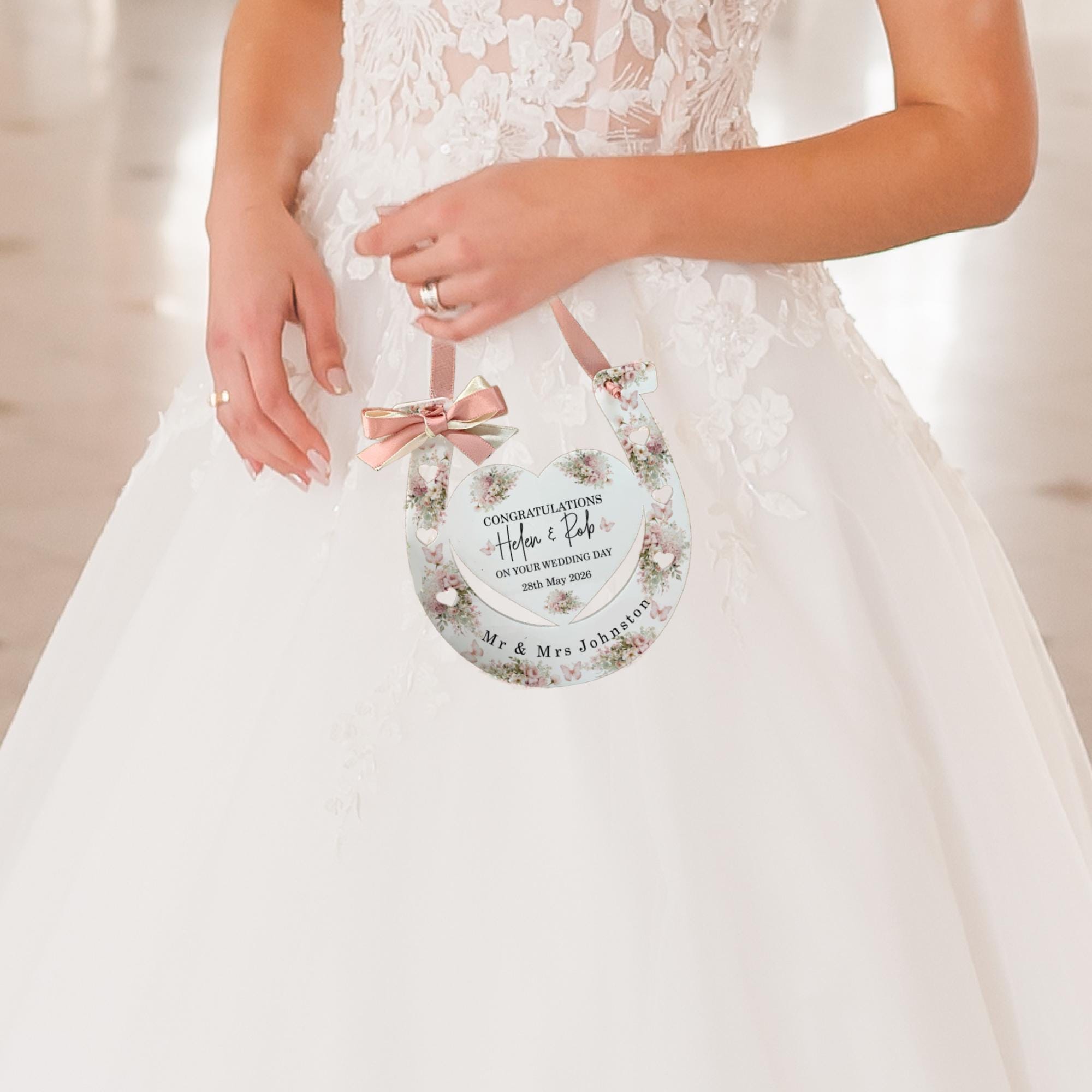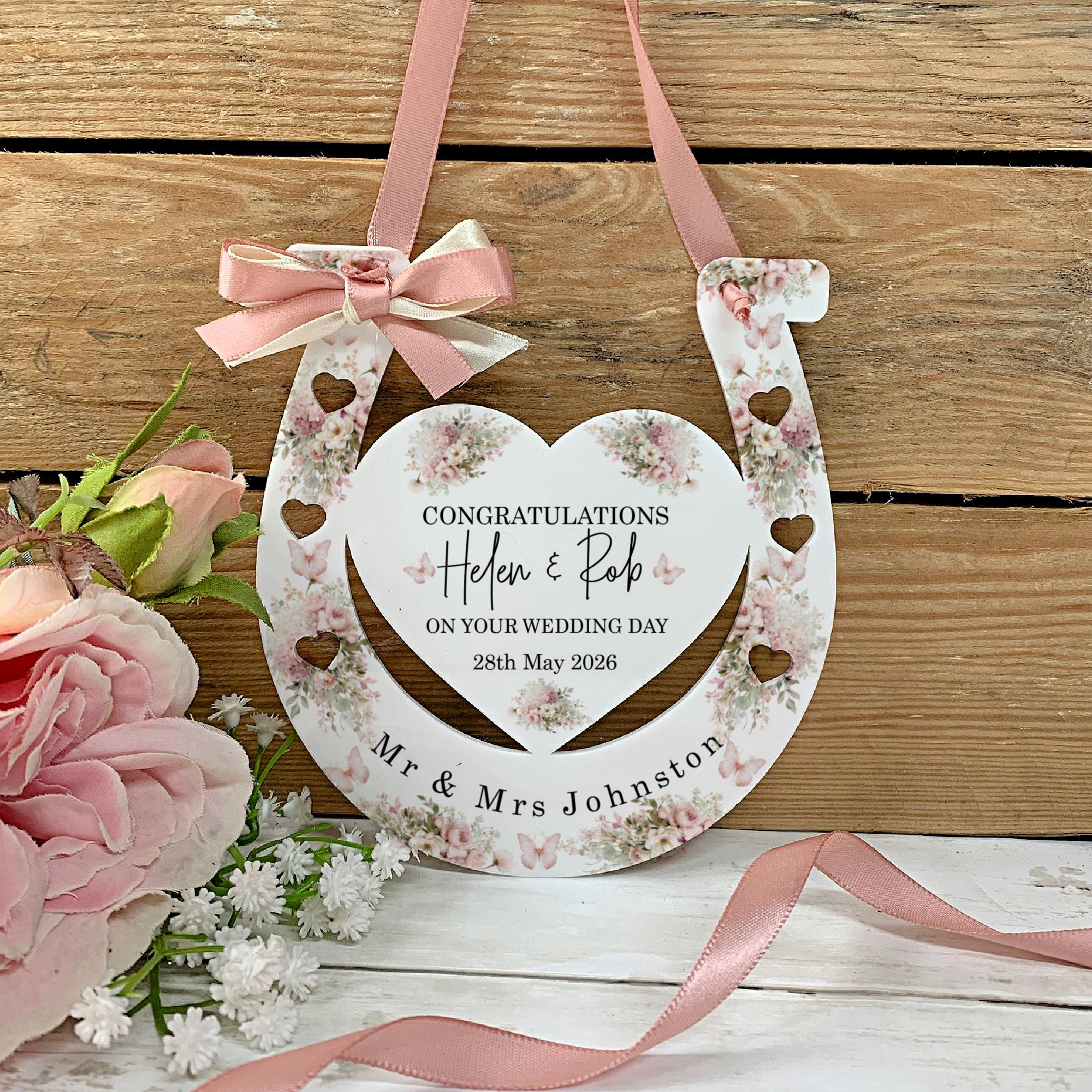 Celebrate love, luck, and tradition with this beautiful personalised wedding horseshoe, designed as a meaningful bridal gift. Adorned with elegant dusty pink floral details, this timeless keepsake makes the perfect charm for a bride on her special day.