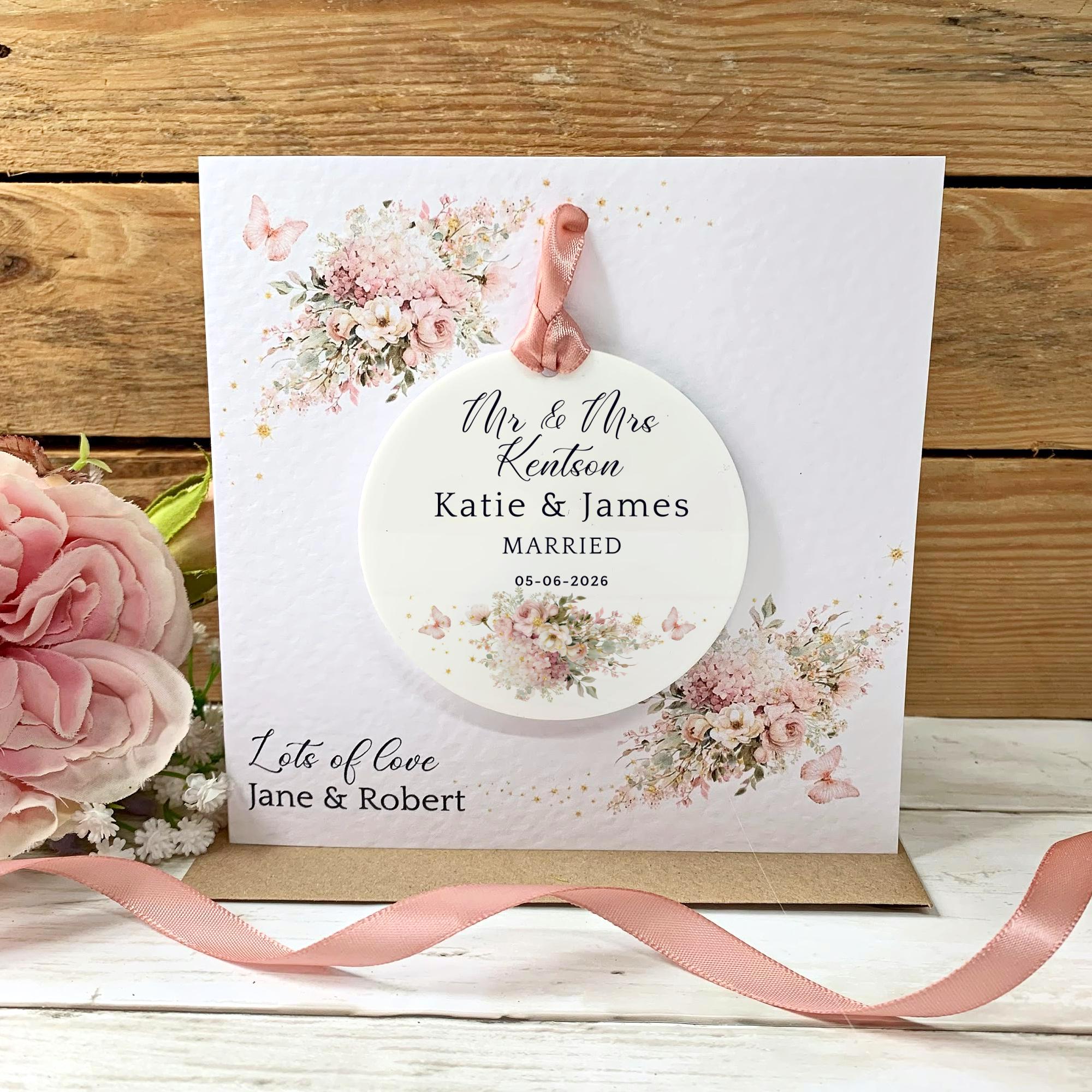 This personalised wedding card features a detachable acrylic keepsake, turning your message into a lasting memory.