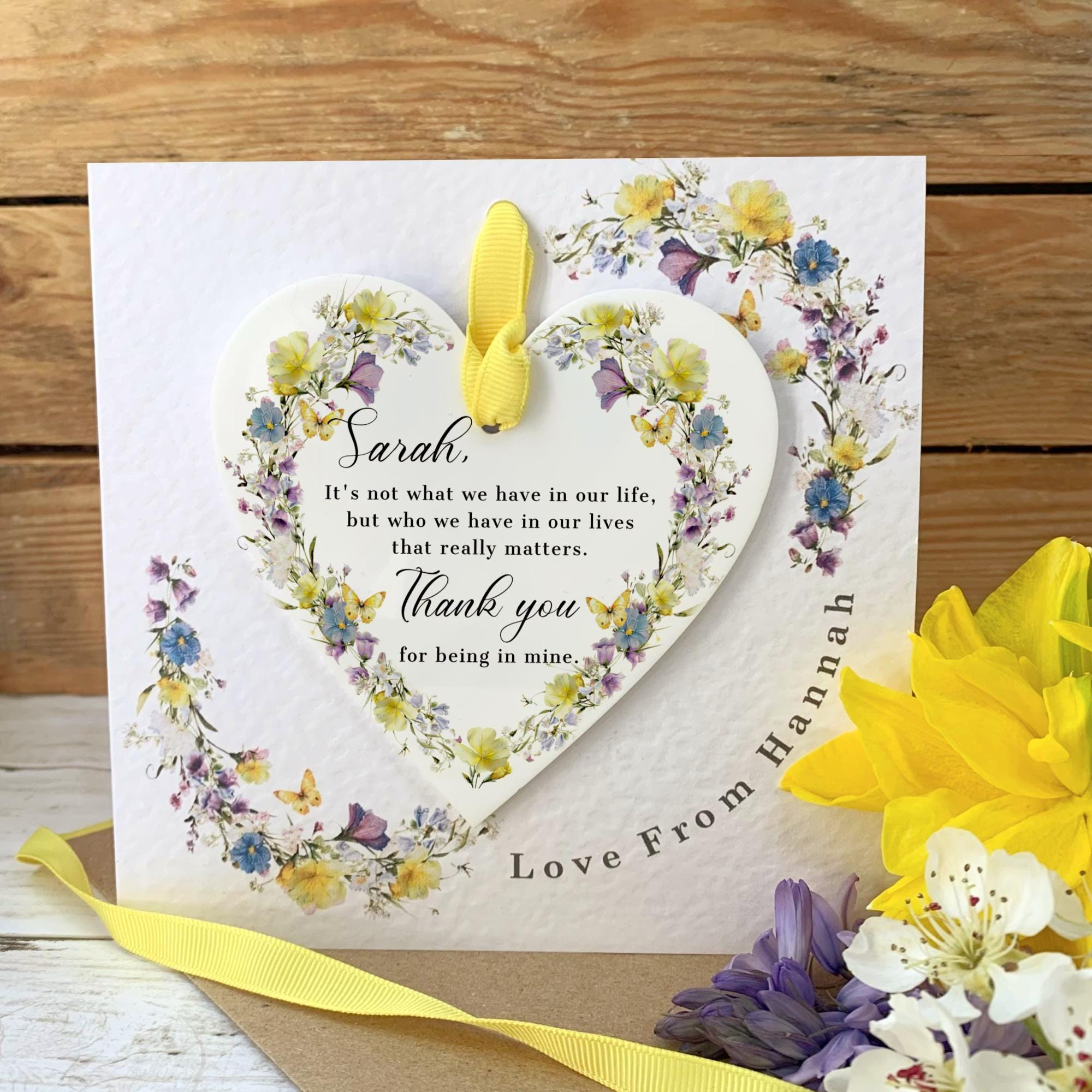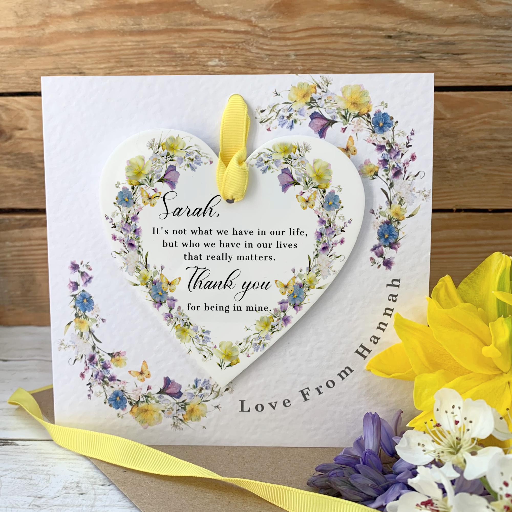 Celebrate a bond that blooms with this Personalised Spring Floral Acrylic Heart Keepsake Card. Each piece features a delicate botanical design inspired by the wild spring blooms found just outside our workshop window in the rural village of Hodnet, Shropshire. Whether you’re looking for a heartfelt Thank You gift or a special Friendship keepsake, this piece brings a little bit of the Shropshire countryside into the home of someone special.