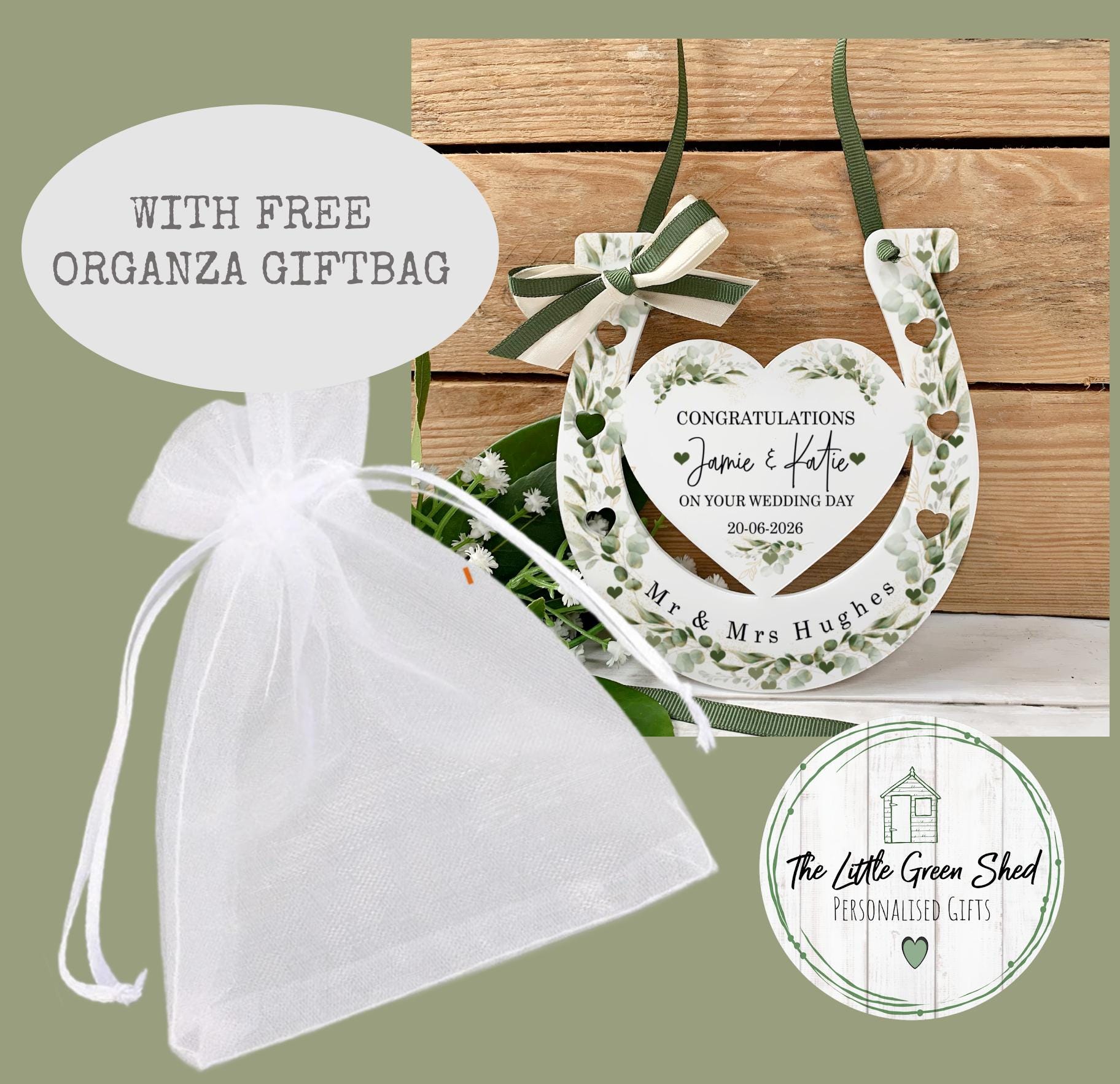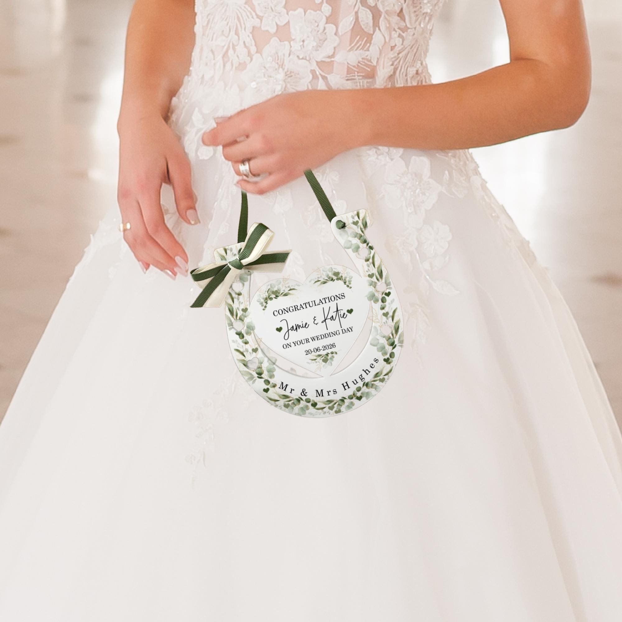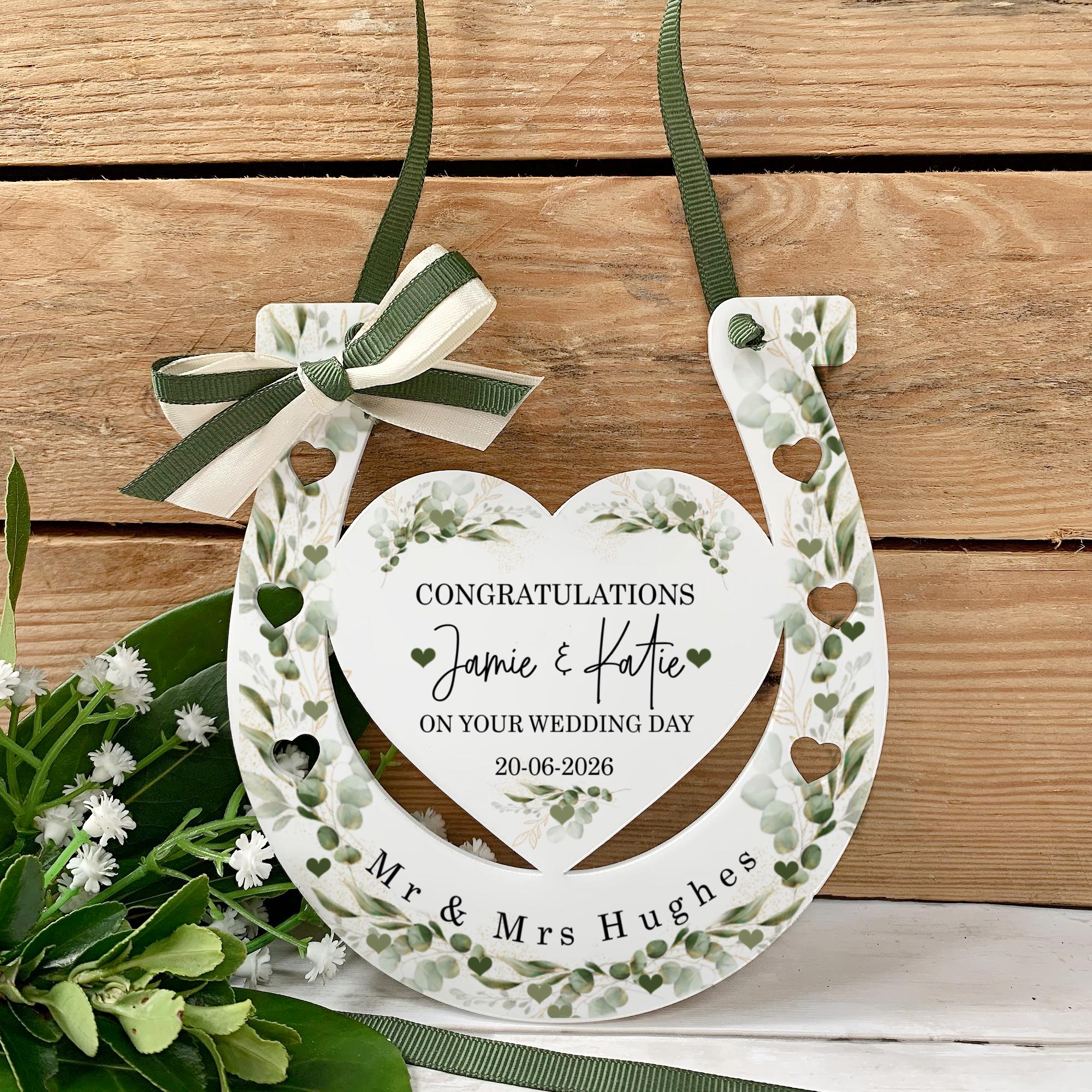 Celebrate love, luck, and tradition with this beautiful personalised wedding horseshoe, designed as a meaningful Botanical design bridal gift. Adorned with elegant greens floral details, this timeless keepsake makes the perfect charm for a bride on her special day.Traditionally gifted to bring good fortune, a wedding horseshoe is a symbolic token of luck, protection, and happiness for the newlyweds. This piece is carefully customised with your chosen names and wedding date, creating a truly unique and sentimental keepsake to treasure forever.
